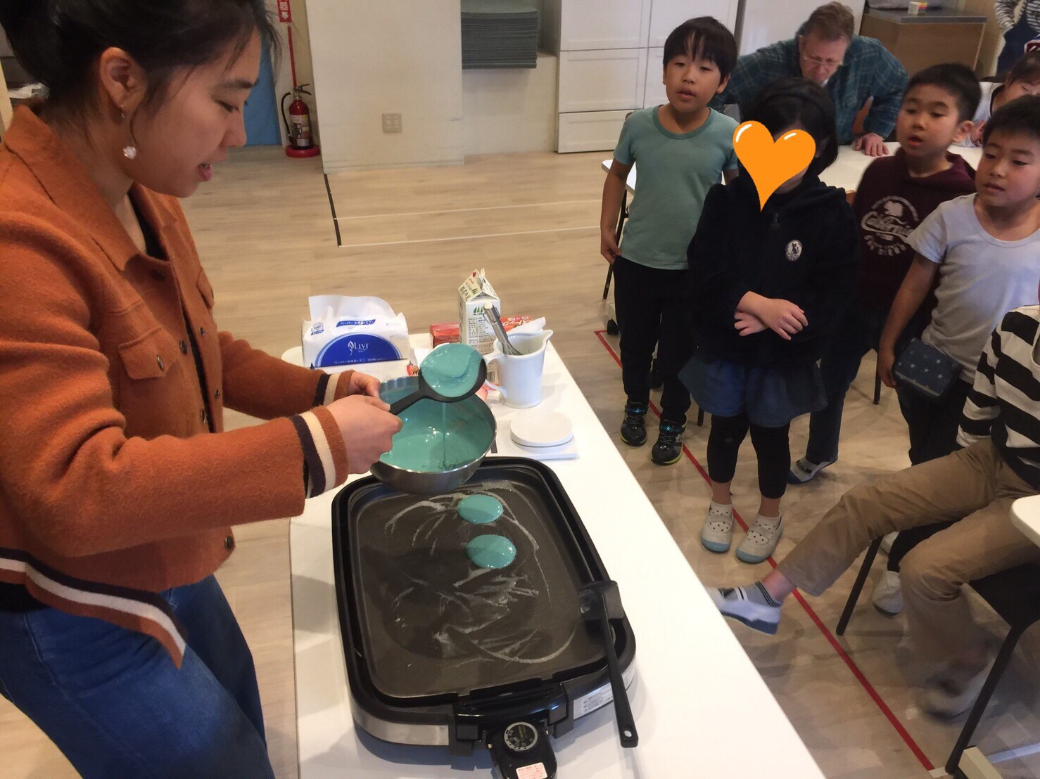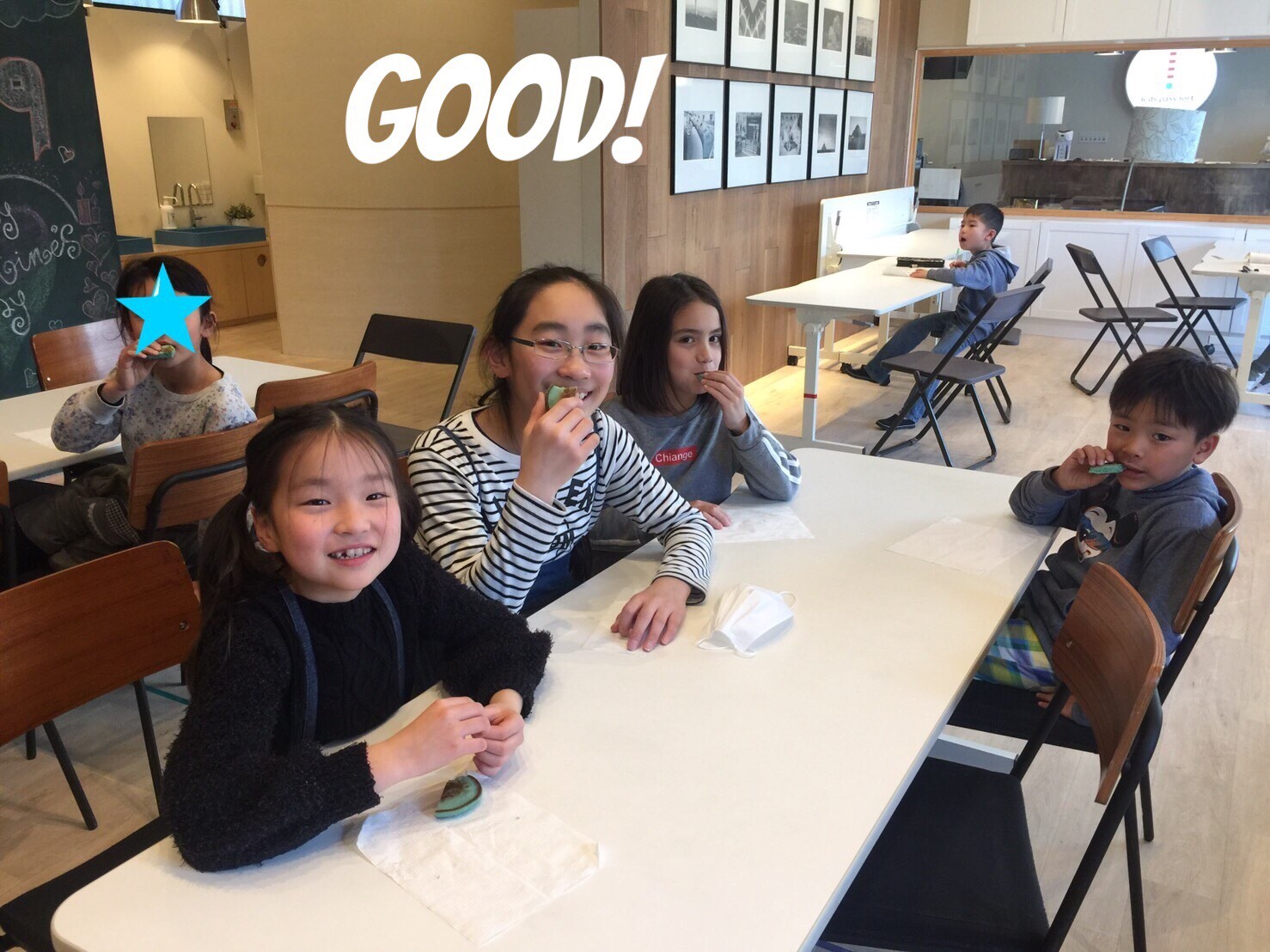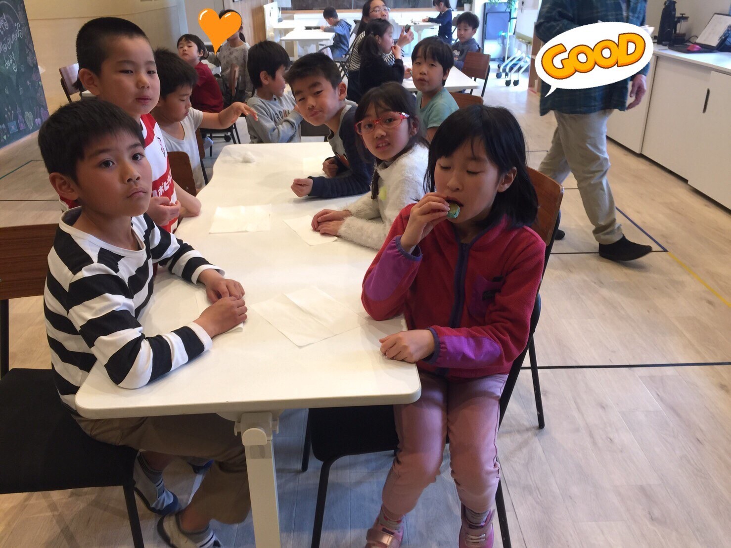 材料を確認して、材料を混ぜて、焼いて・・・”Let’s eat!”(いただきます!)