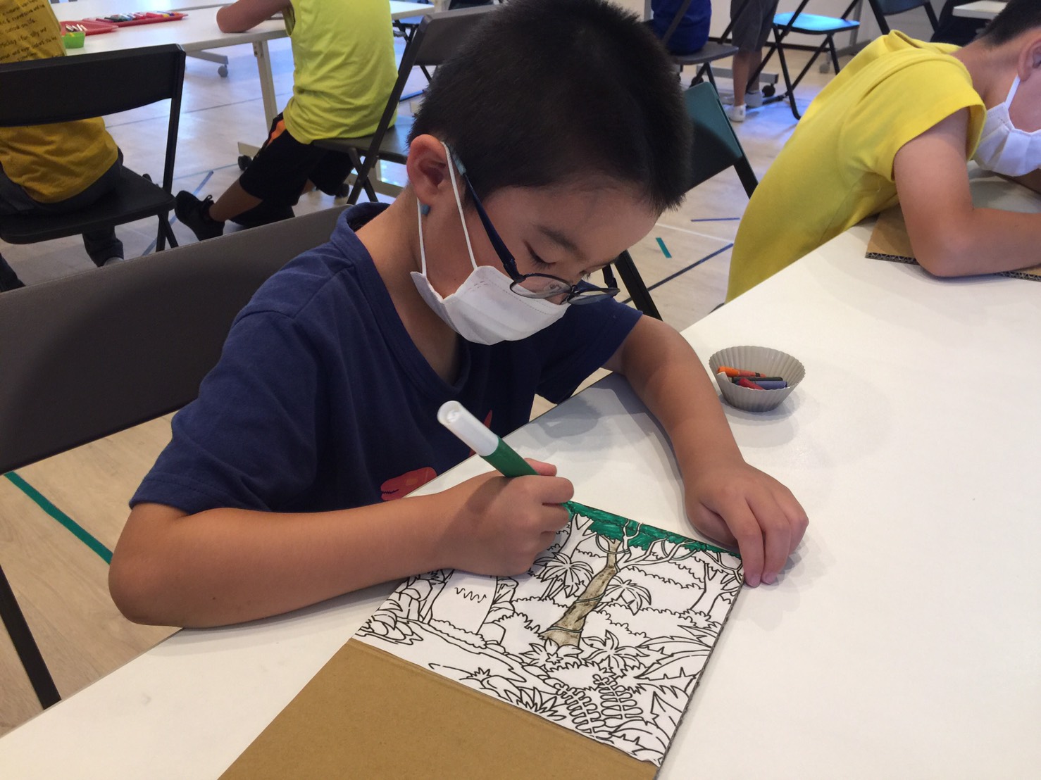 ジャングルの塗り絵を上の段ボールに貼り付けたら、好きなように色を塗りました。