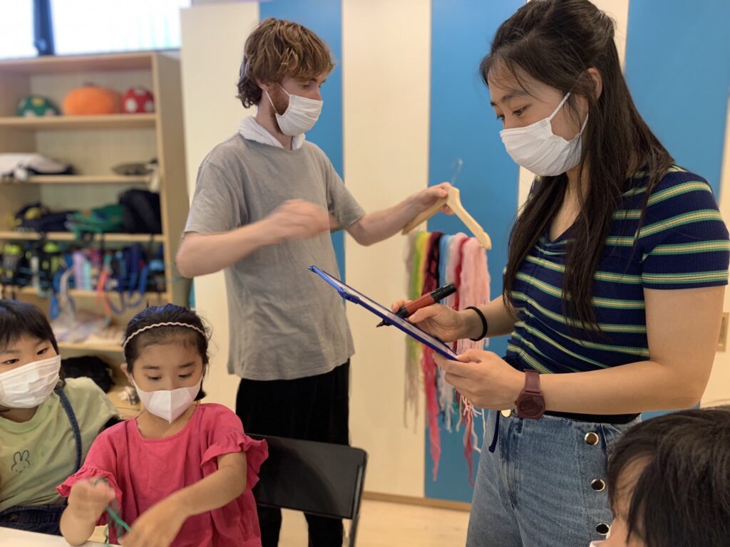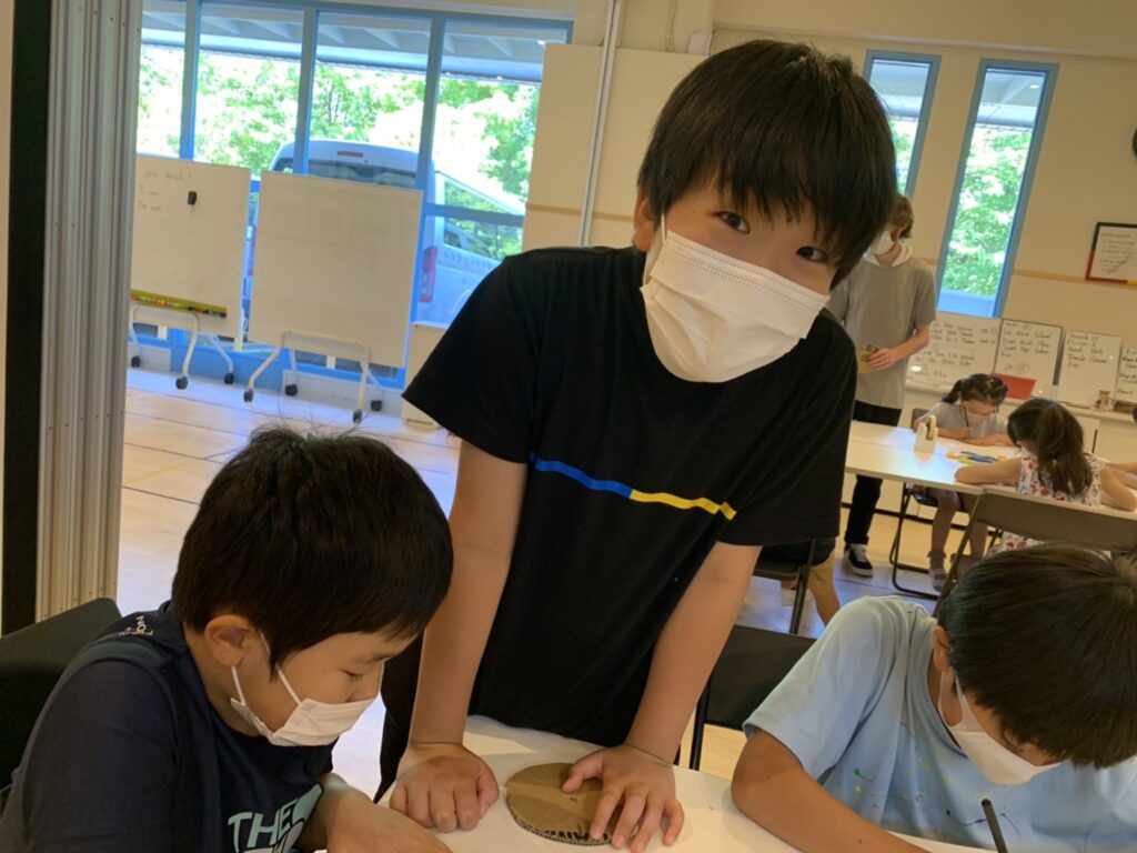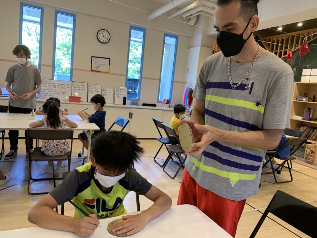 (段ボールディスクを持ち、切りこみに7本の毛糸を通し、1つ空いてる切りこみを上にして、3つめの毛糸を動かしていく)