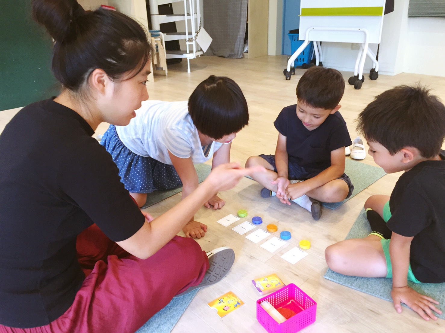 宿題がない生徒さんは、キャスパー先生とカードゲームを楽しみながら、英単語とそのカードをつかってセンテンスづくりの練習を行いました。