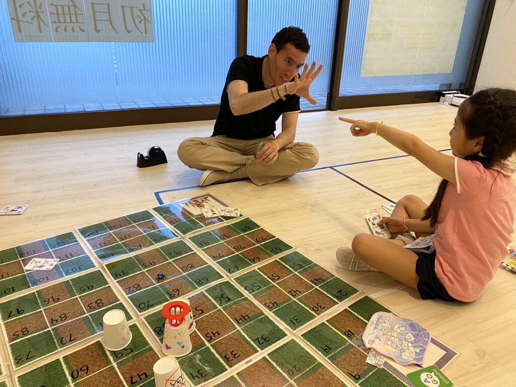 先生:Do a big gesture ! (ジェスチャーを大きくやってみて!)