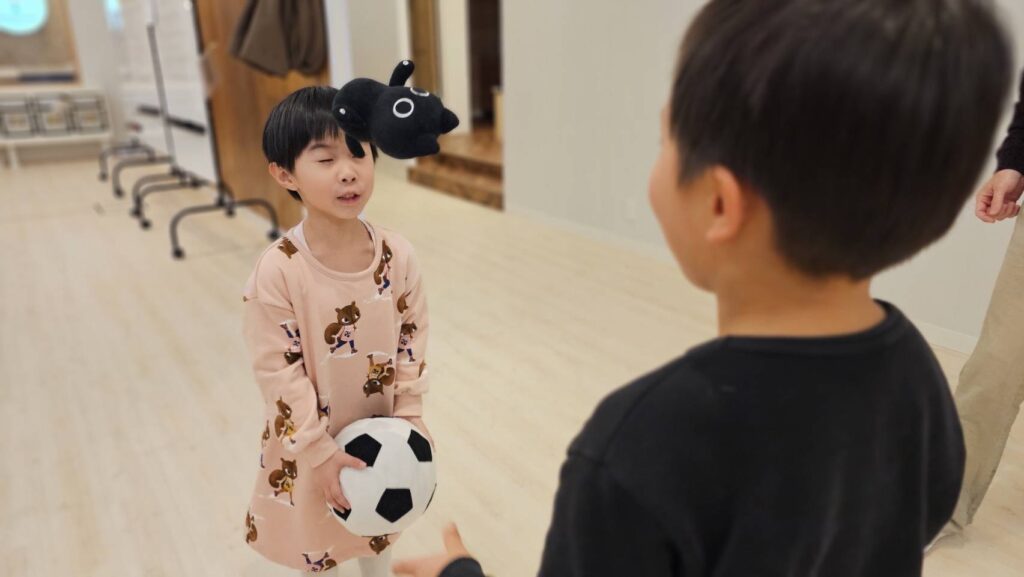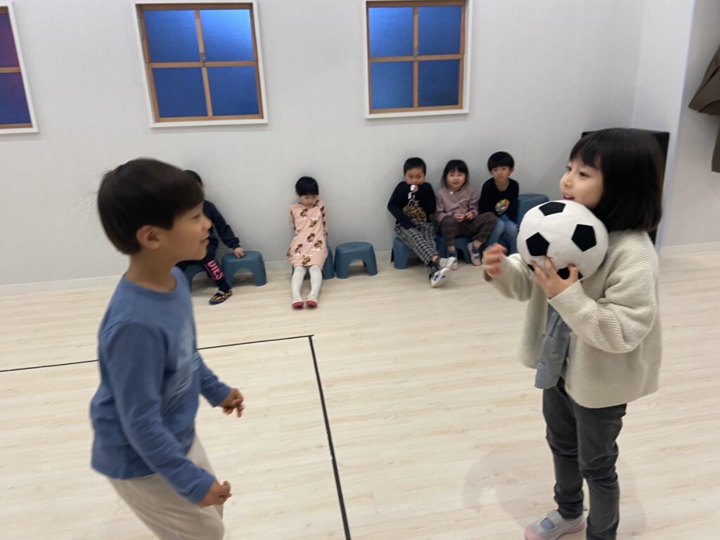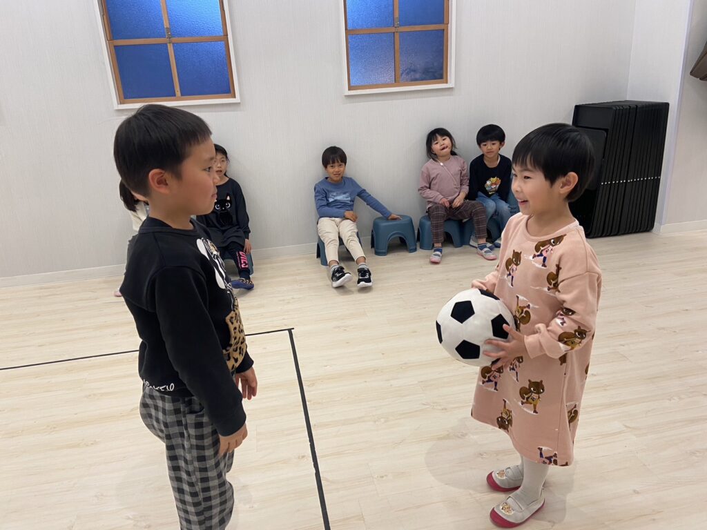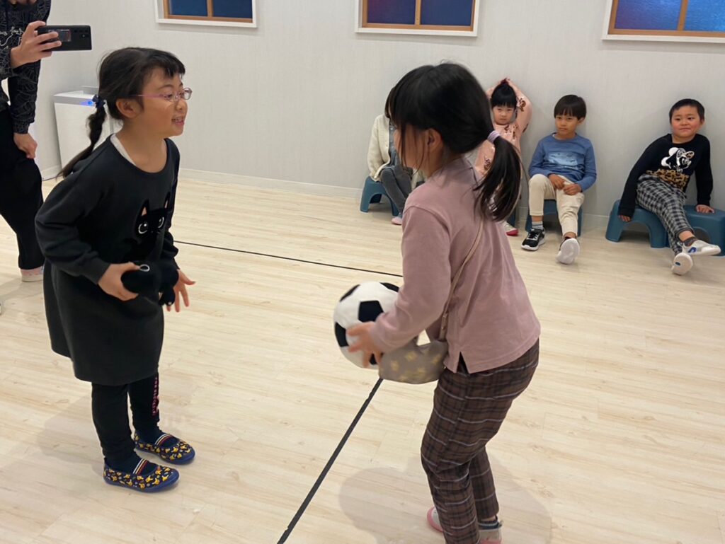 ボールが2つになり、お互い投げあうラウンドでは投げることに集中し、キャッチしない子どもがたくさんでお互い笑いが止まりませんでした(笑)