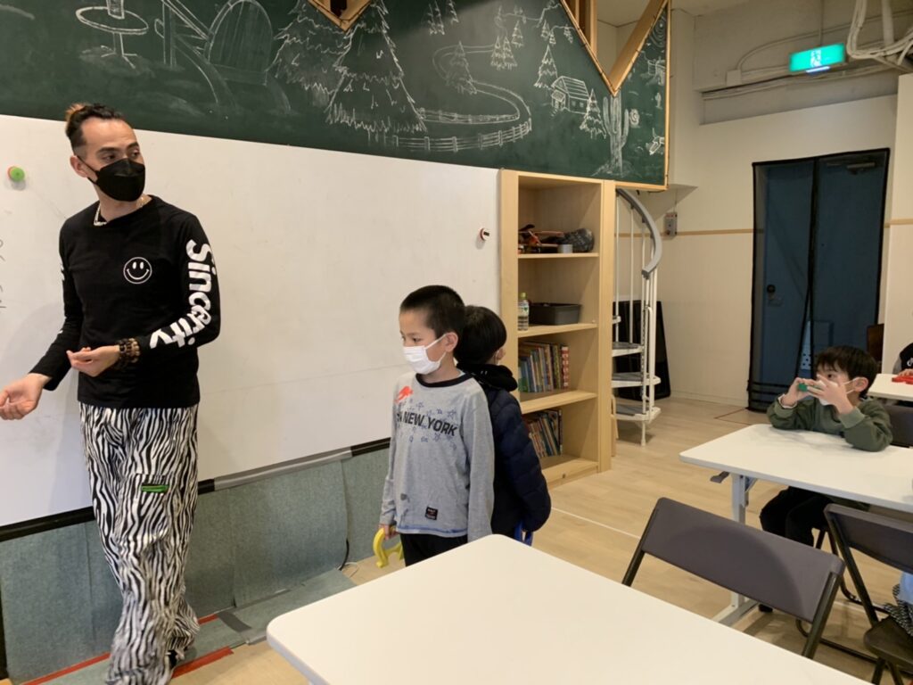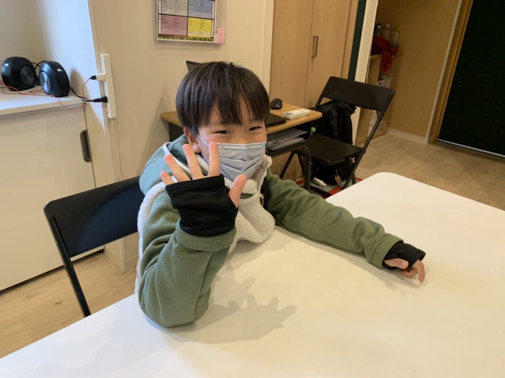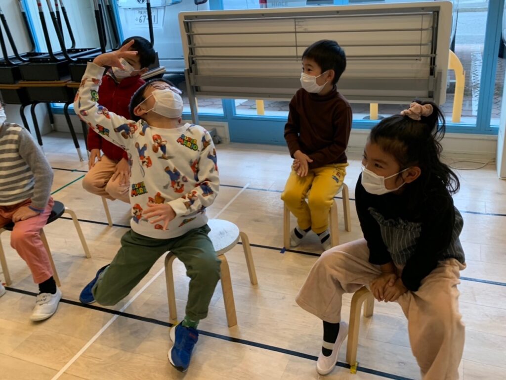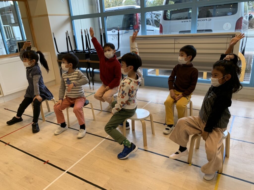 先生が質問を投げかけ素早く手を挙げて答えるゲーム