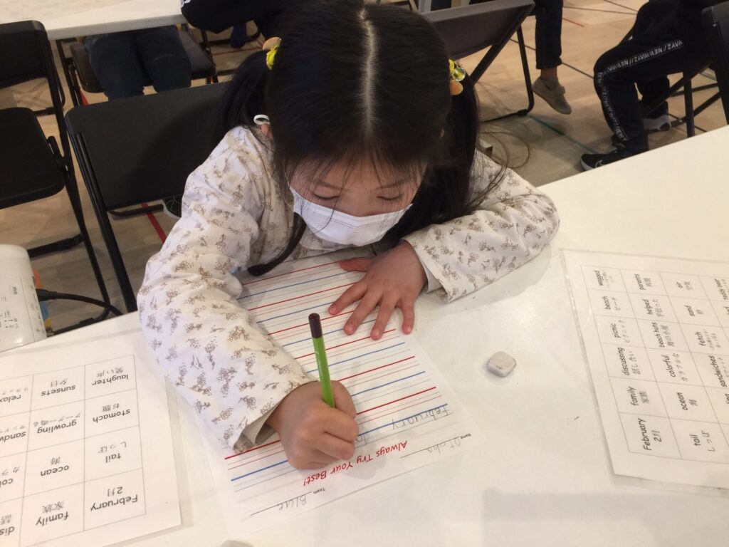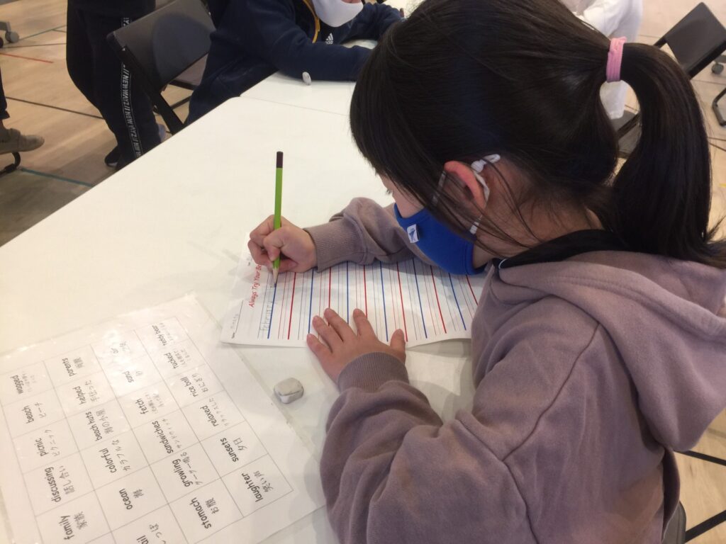 今日は2月4週目の単語の練習でした。ワークショップに入る前に改めてReading(リーディング)とWriting(ライティング)のHomework(宿題)について説明があり、みんなで実践してみました。