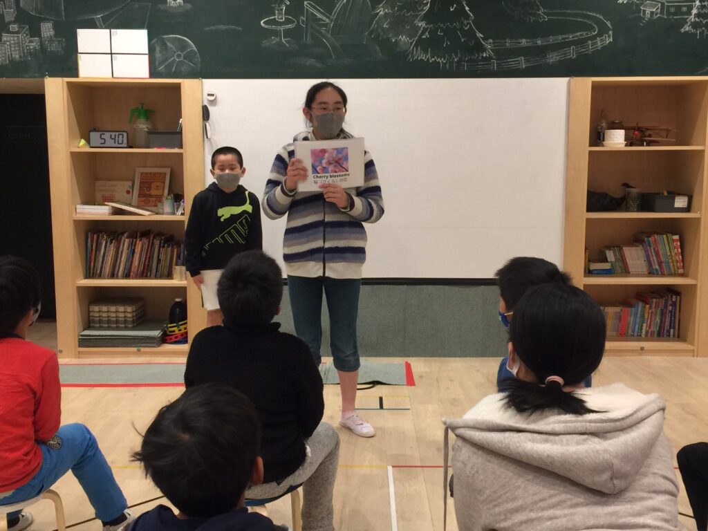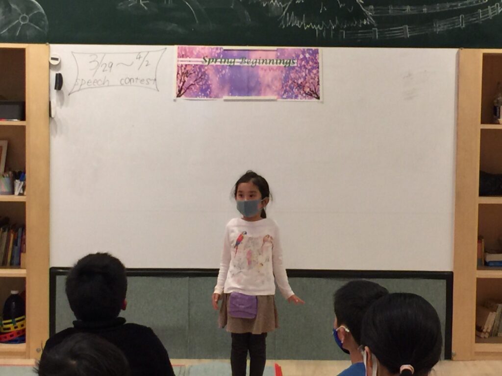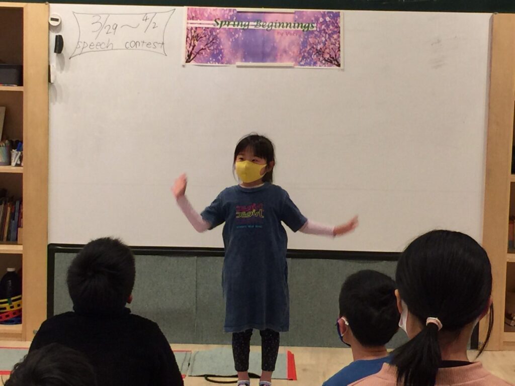 ストーリーの発表や劇の練習、単語の練習などみんなの前で発言する場面がたくさんあります。その時に声が聞こえないとせっかく上手にできていてもわかないのでもったいない!最初は自信がなくてもやっていくうちに上手になるよ!