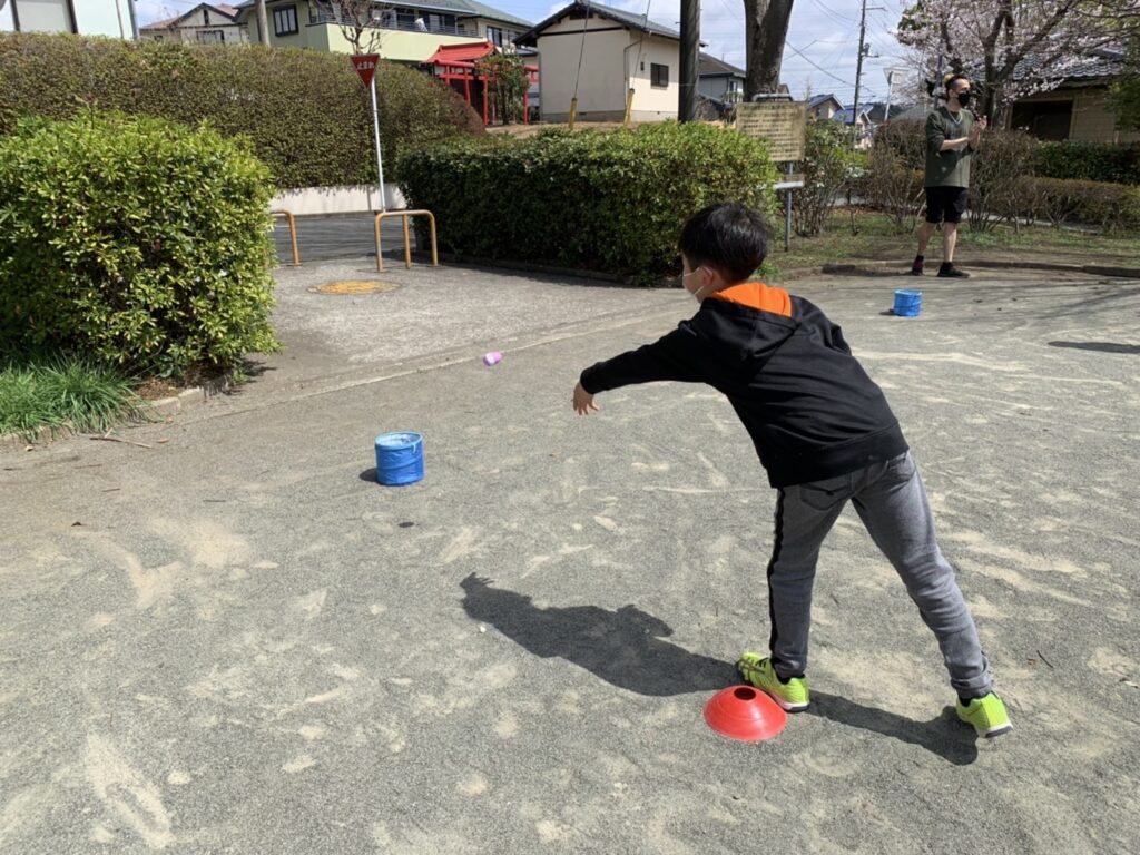 各チーム5人選びエッグをパスしてバケツに入れるゲーム