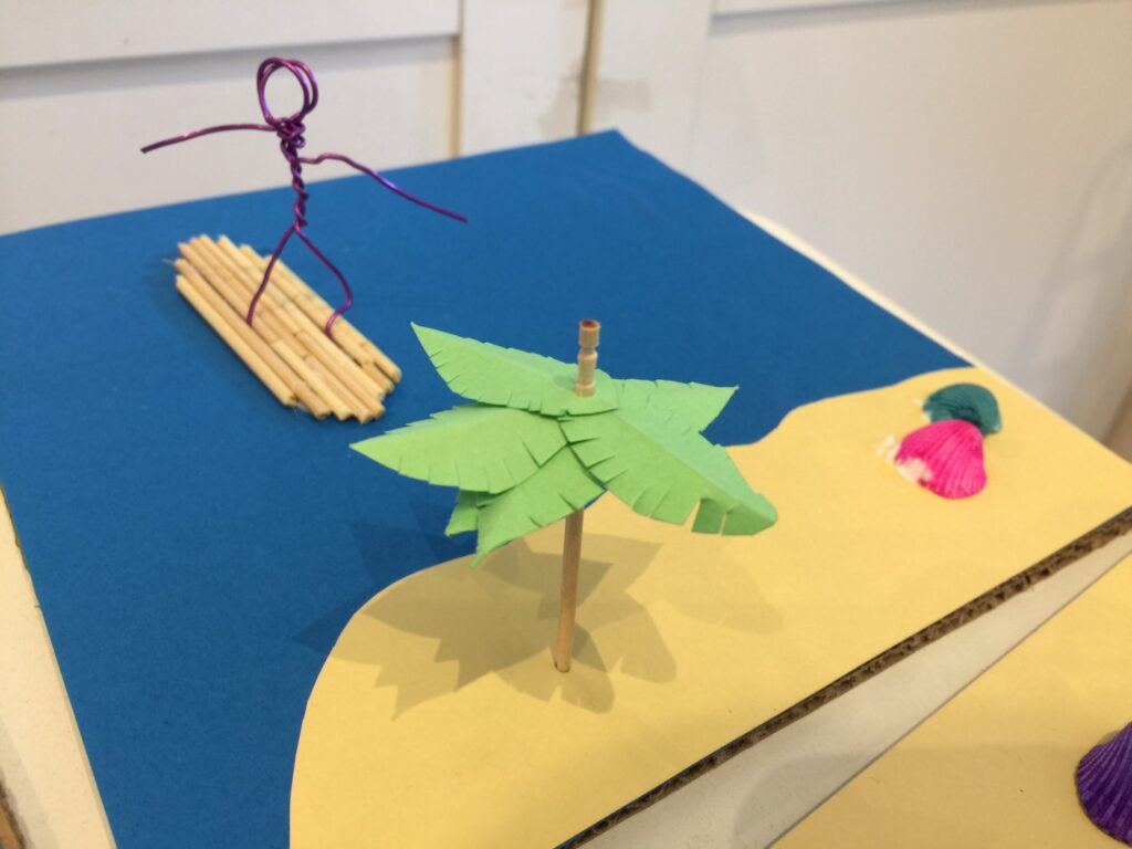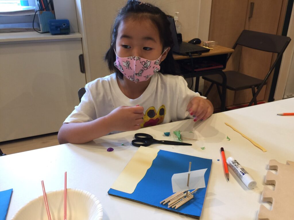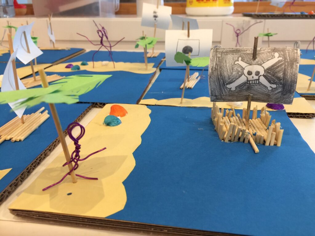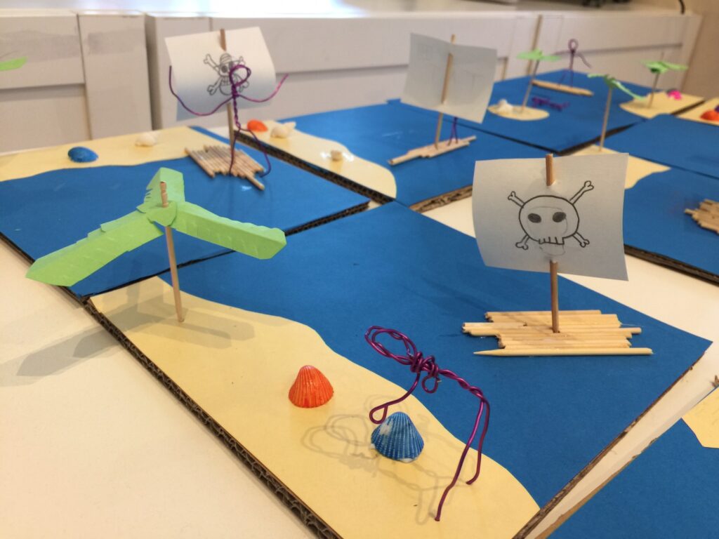 段ボールに画用紙を貼り竹串を使っていかだを作ったり