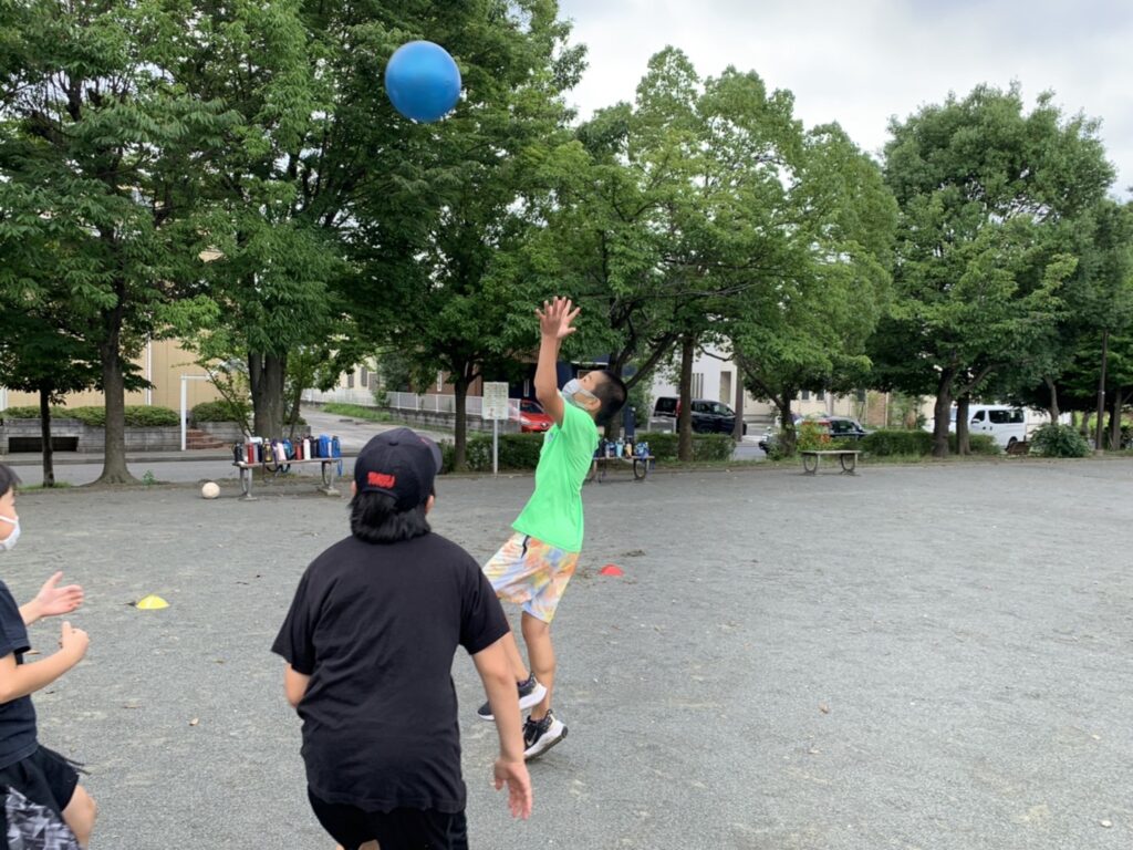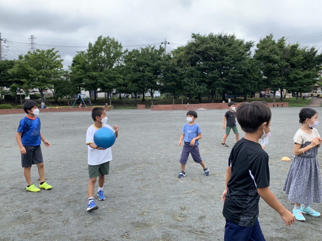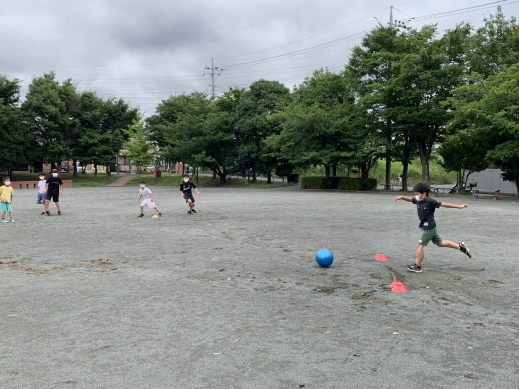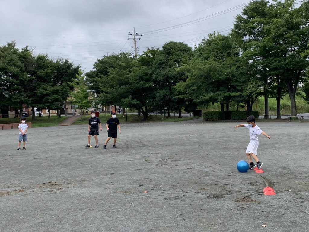 (先生がピッチャーをやるからみんなはボールを蹴ってね)