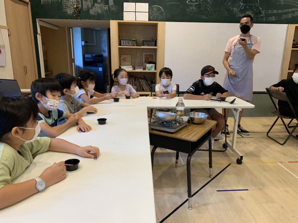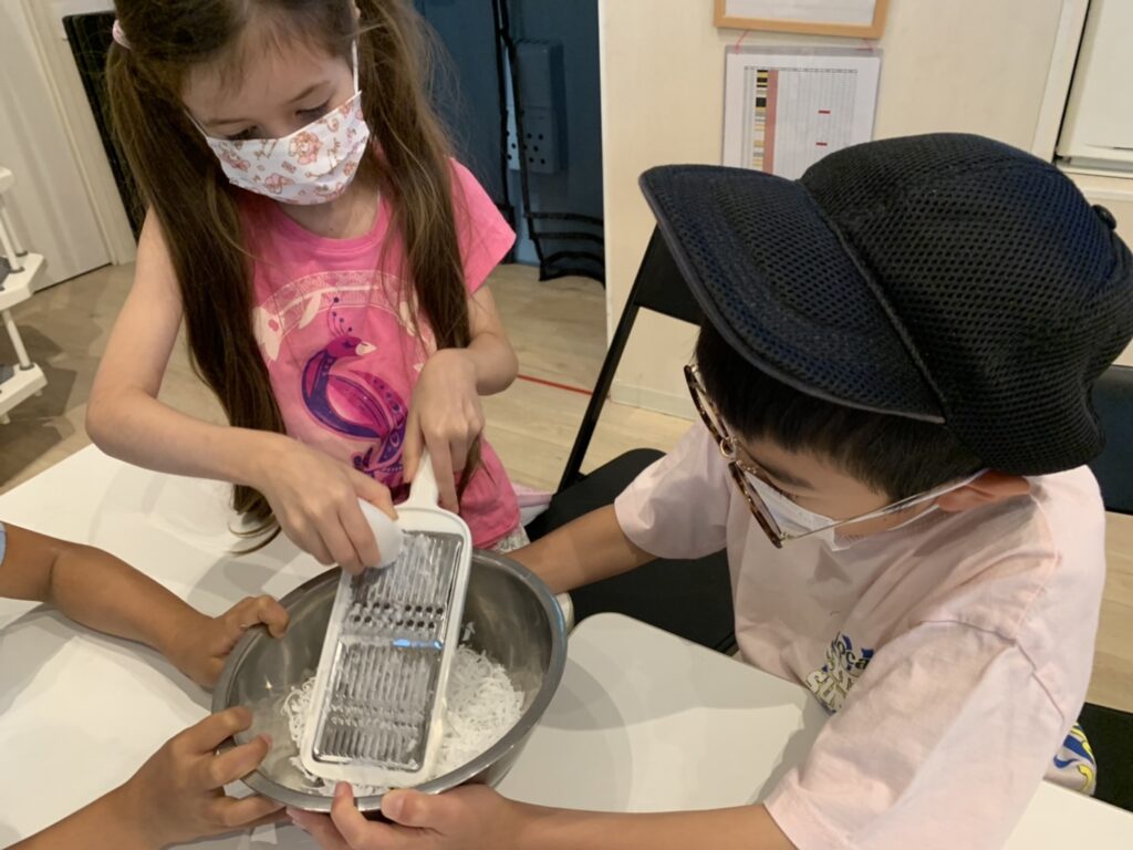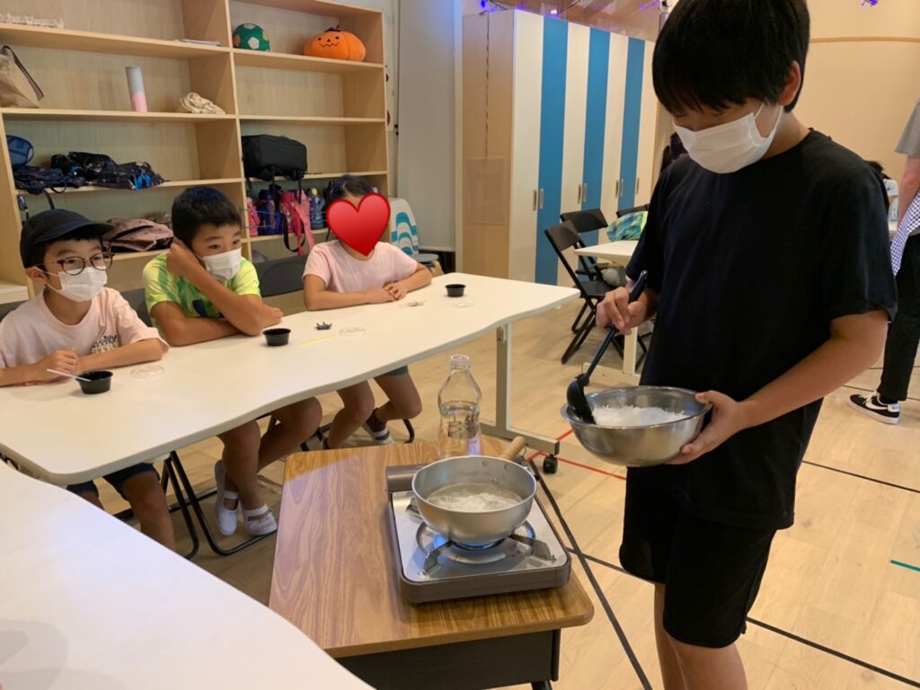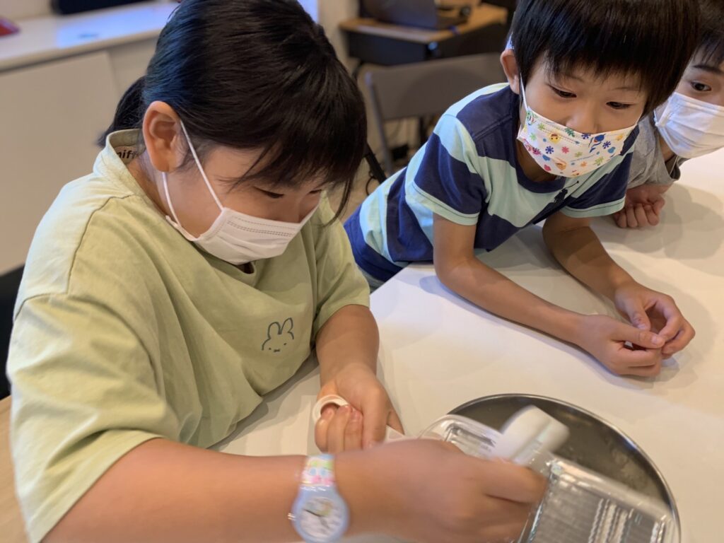 次は石けんを液体に溶かしてからみんなのカップにいれたあと