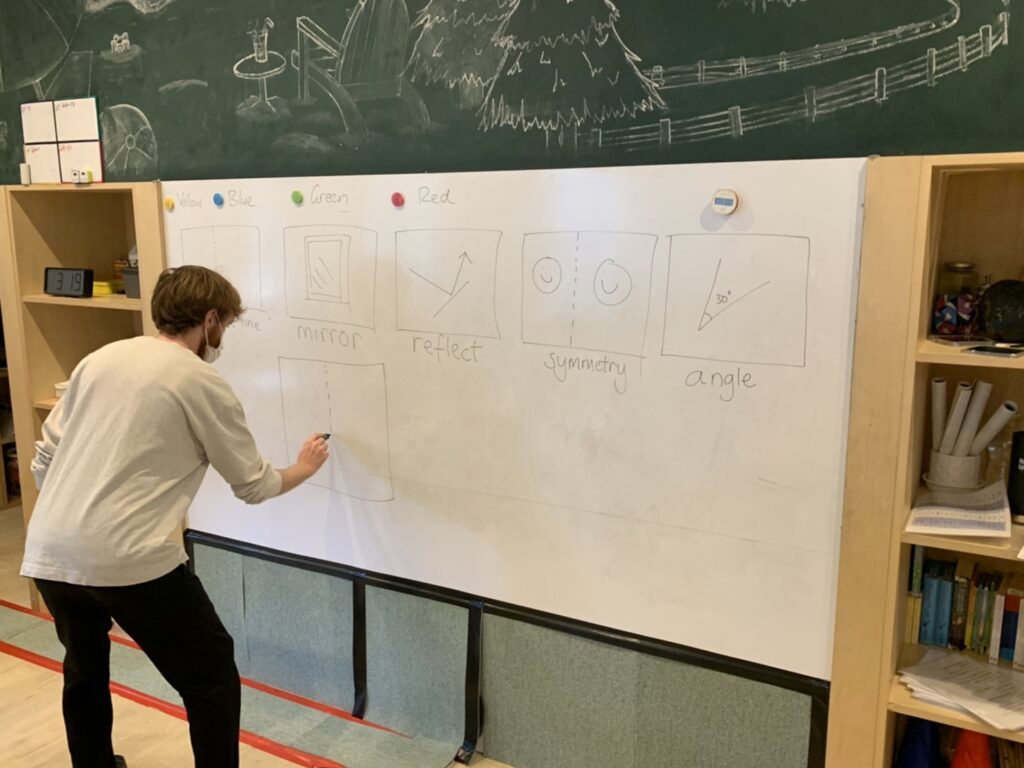 まず先生が大きな紙を持ってきて絵を描き絵を描いた後にその紙を半分に折って開くと反対側に左右対称の絵が映ります