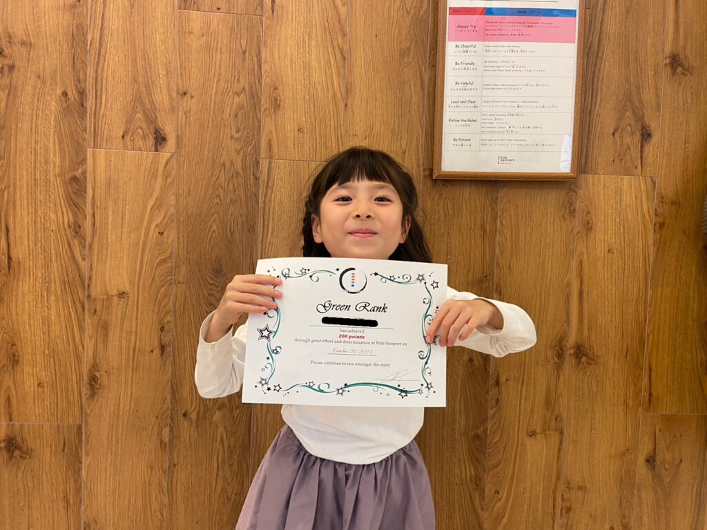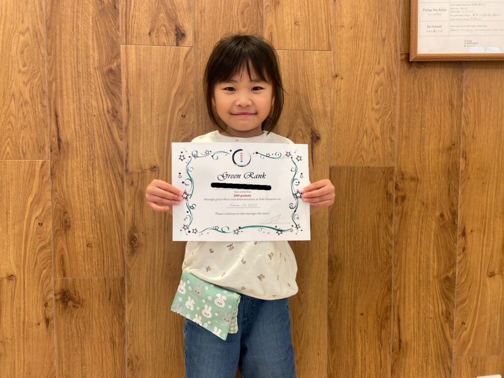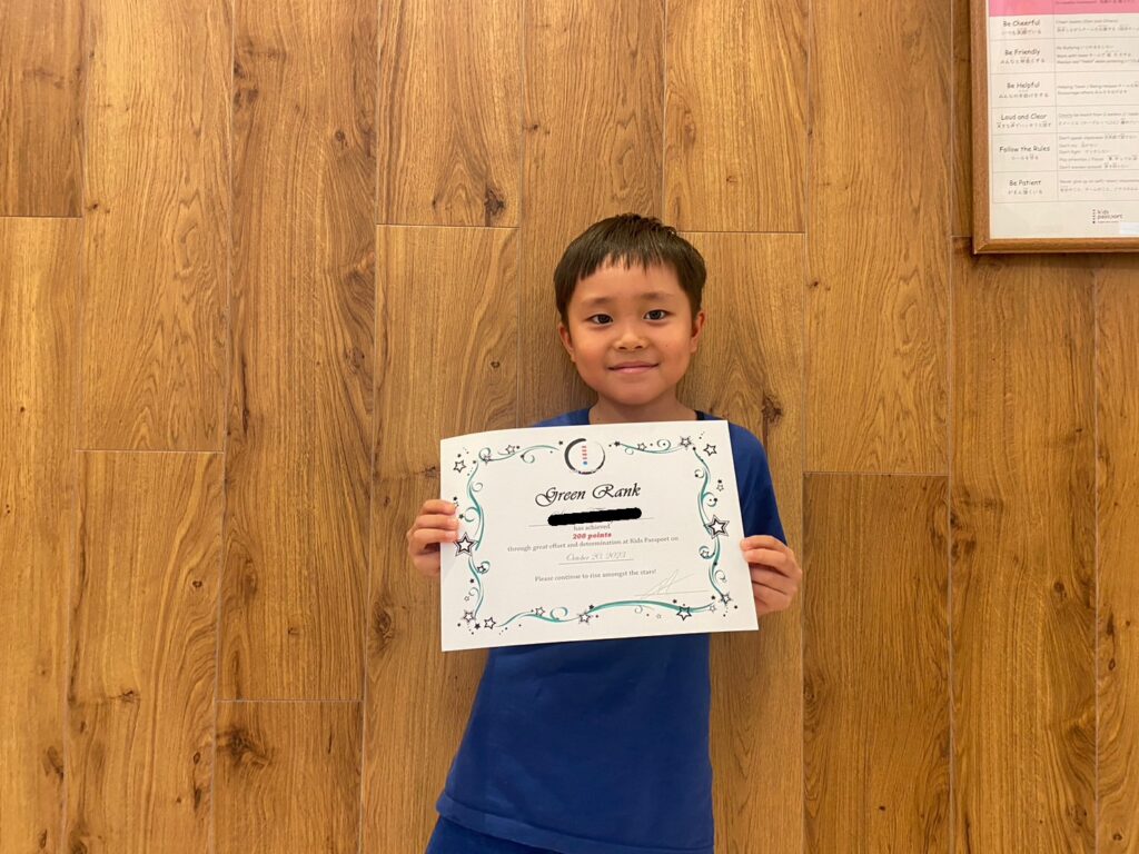 ランクアップするとこのように表彰と、スクール内でのお買い物で使える、キッズパスポートポイントがもらえます!