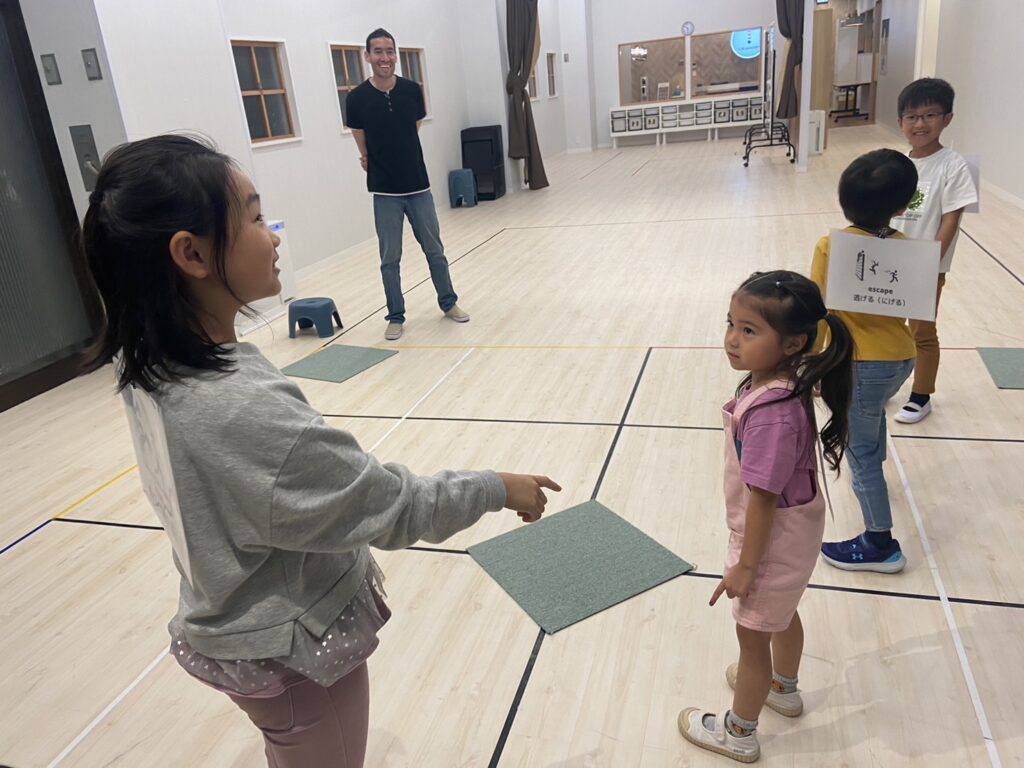 (それをするよ!でも触らないの。単語カードを背中につけてね。)