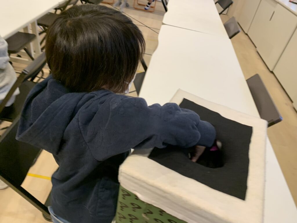 箱に手を入れてどんな感触か答えて、箱の中のものが何かを当てました