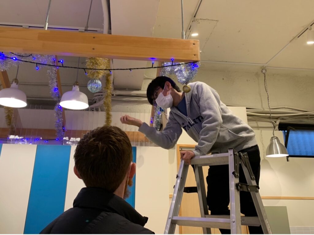 クリスマスツリーや教室にオーナメントやライトを