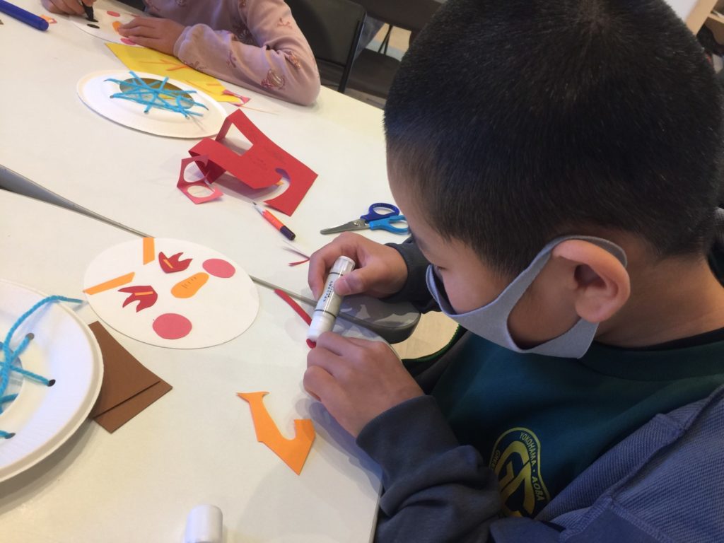 ドリームキャッチャーを作るときのように順番に毛糸を通して好きな形を作っていきました。低学年の子たちには少し難しかったみたいで、