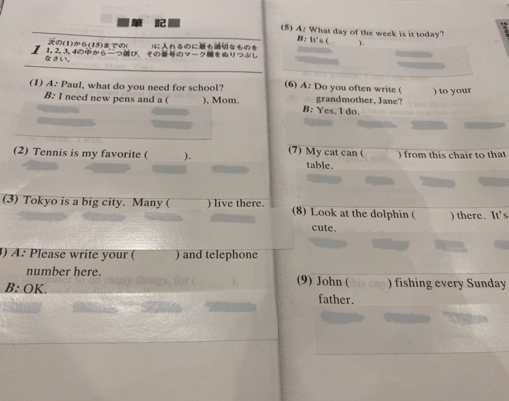 英検5級、4級と3級の過去問題の選択肢の部分を消して、自分たちの実力で正しい答えが導き出せるかな?のテストをしました。