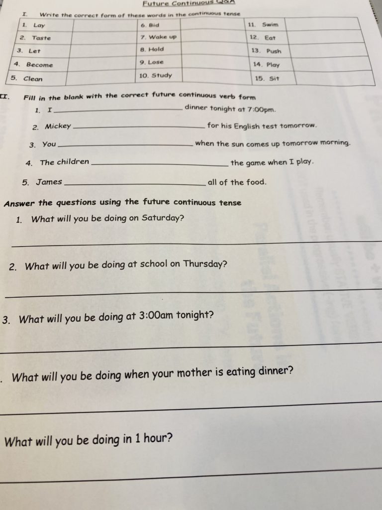 Answer the questions using the future continuous tense.(未来進行形を使って問題に答えてください)
