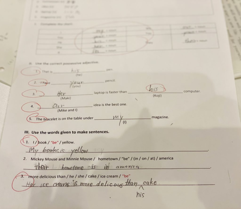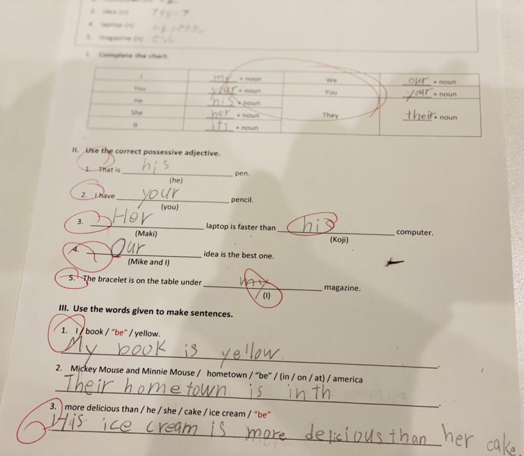 Use the correct possessive adjectives. (正しい所有形容詞を使ってください)