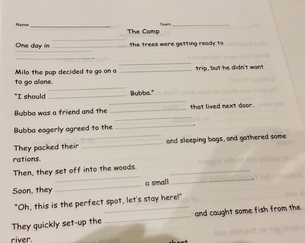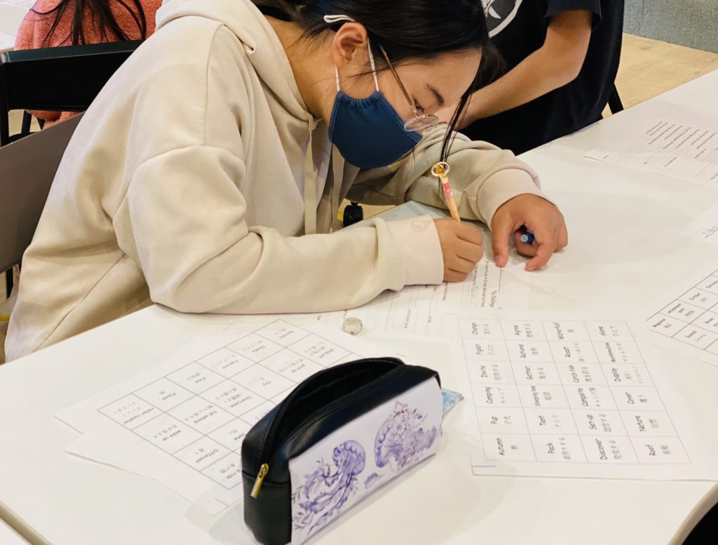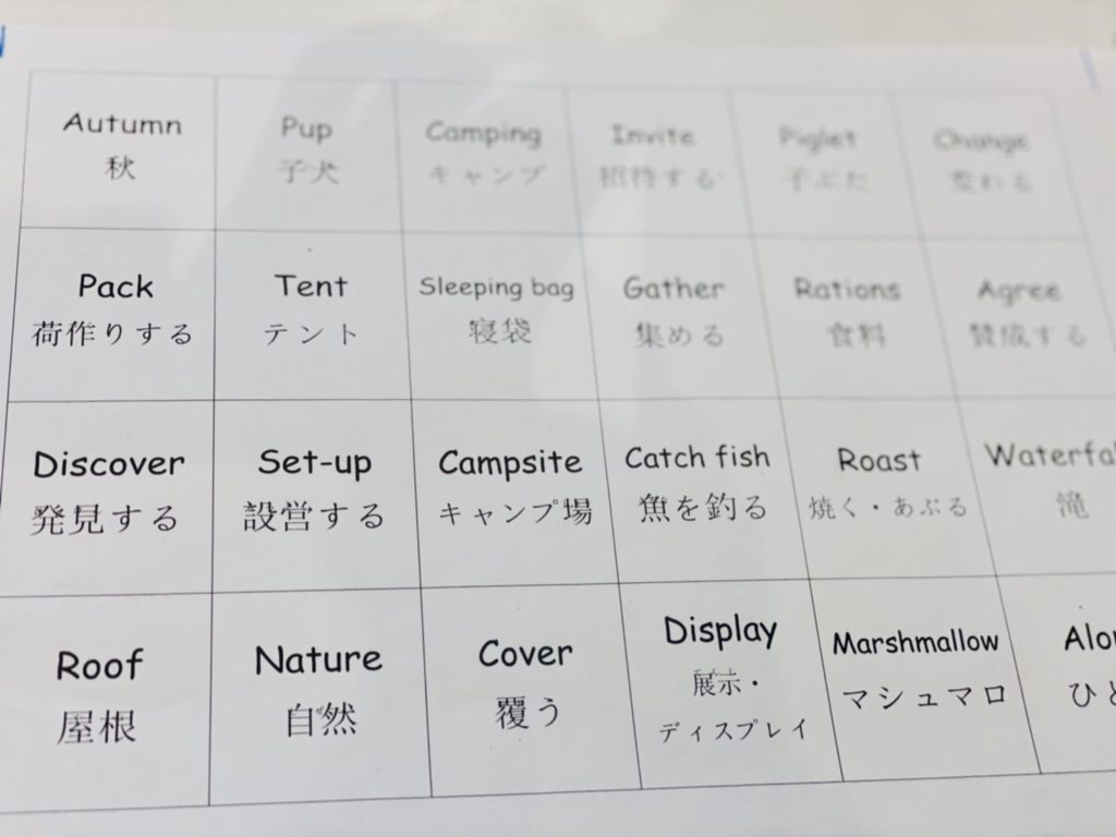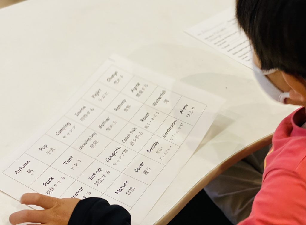 ストーリーを読みながらや声に出して言いながら、単語表を頼りに覚えている限り、空欄を自分たちで書きました。
