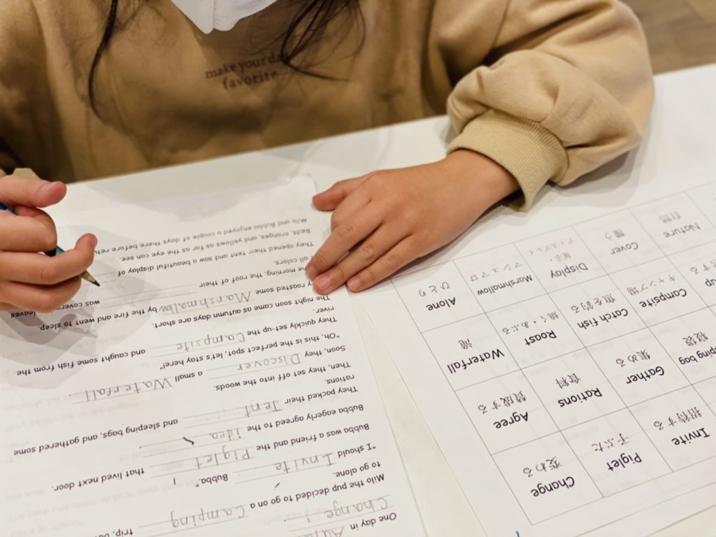 Blank space(空欄)のあるストーリーペーパーとVocabulary chart(単語表)を手に、ストーリーを完成させるチャレンジ。