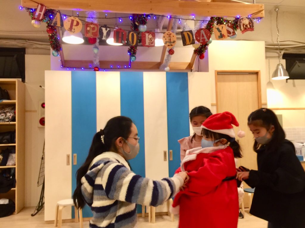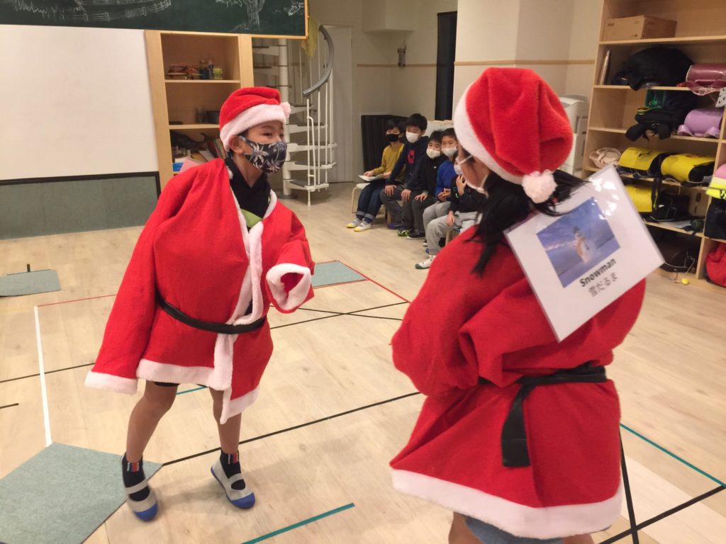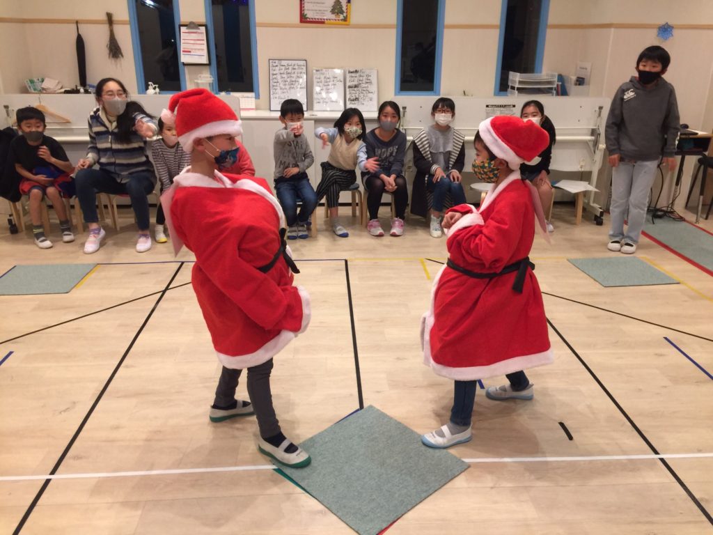 今日のMain game(メインゲーム)はクリスマス限定のVocabulary Sumoです。 サンタのコスチュームをどのチームよりも早く着て準備をし、相手チームが持っている単語を当て、時間内に中心に置いてあるマットに立っていた人が勝ちです。