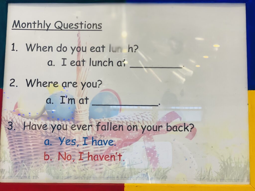 a. I’m at __________.(私は○○にいるよ) - Have you ever fallen on your back?(あおむけに倒れたことある?)