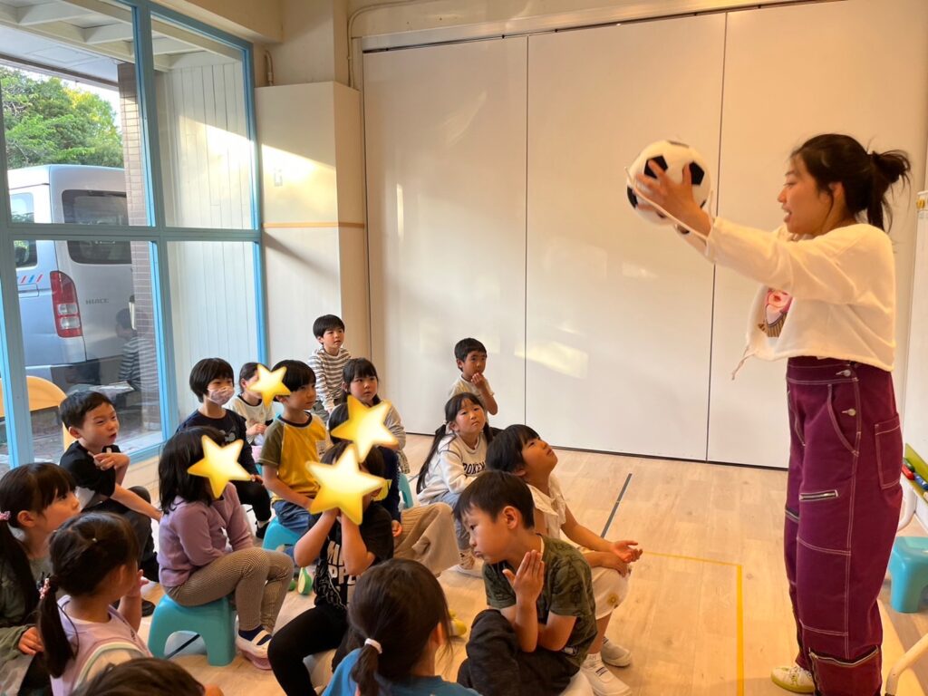 (先生がボールをパスするから、マネして、単語を言いながらパスしてみよう!おっけー?)