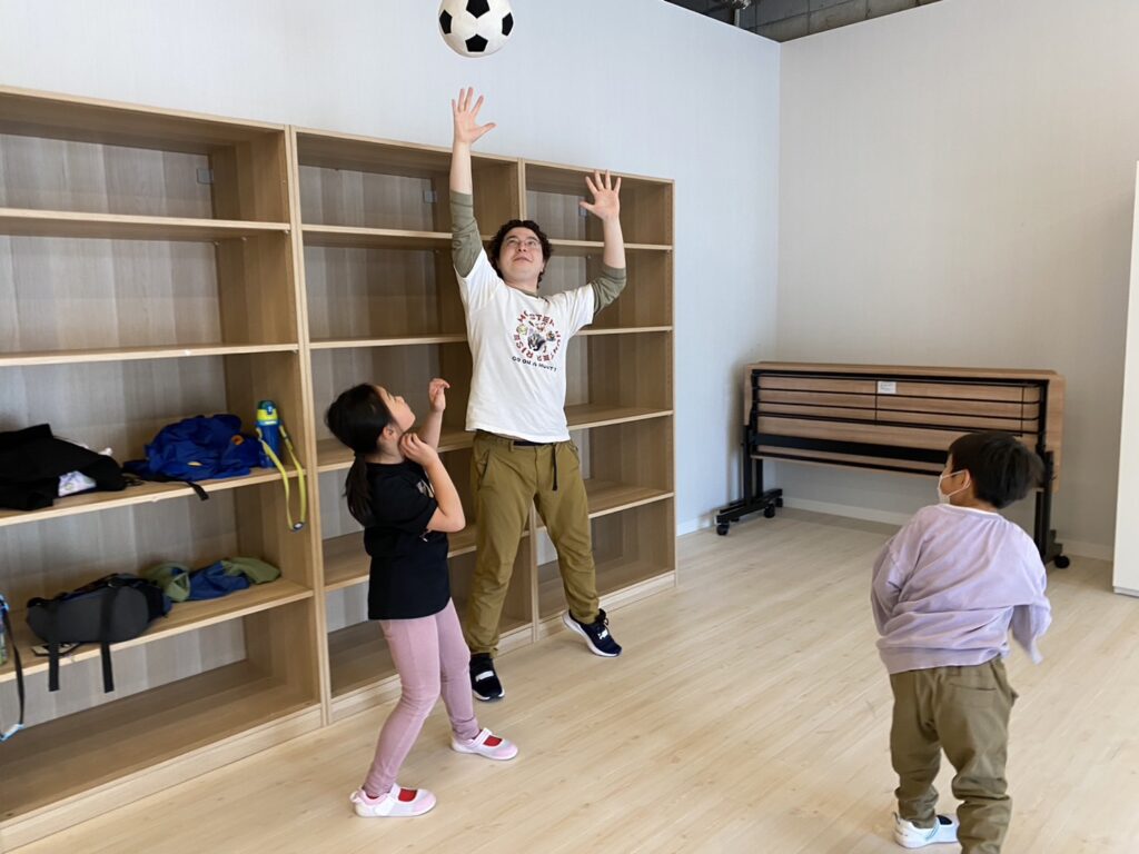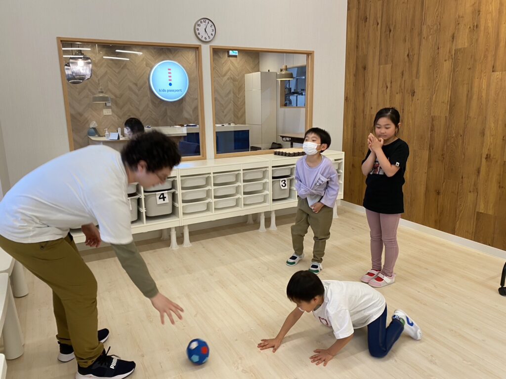 ボールを使いながら、What is in the bushes ? などの英語の質問を学習しました!