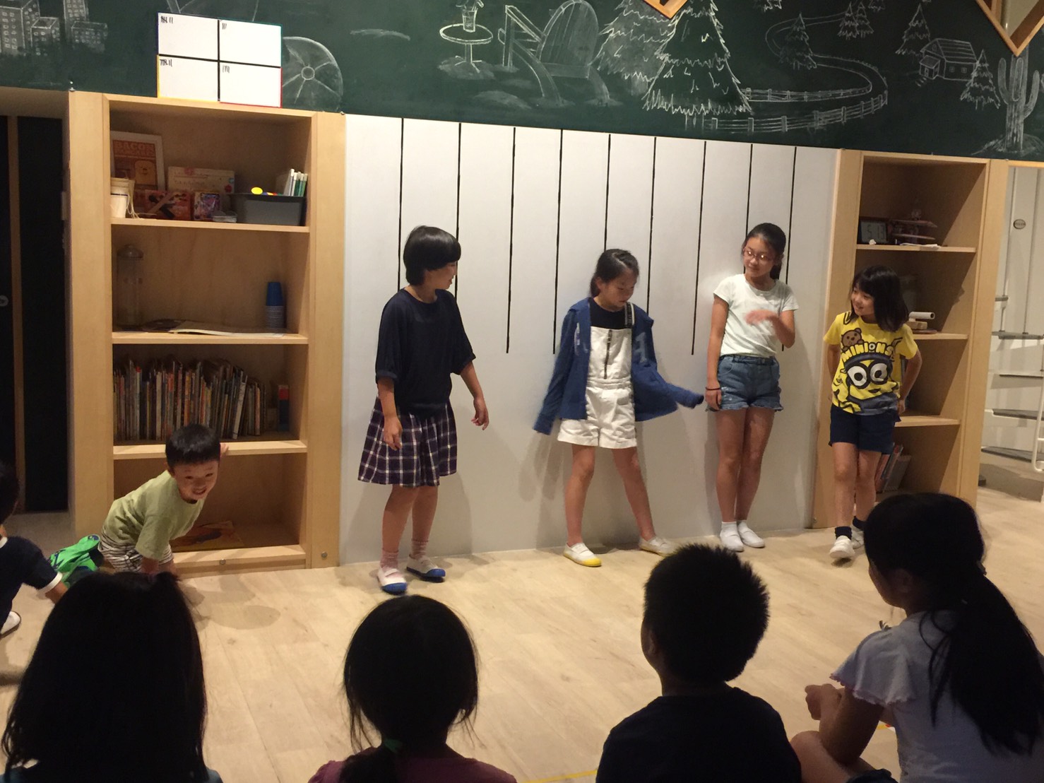 4つのチームそれぞれに”Theme”(テーマ)があり、テーマにそったストーリーや登場人物、セリフなどを話し合って練習をして、みんなの前で2分ほどの短い劇を披露してくれています。