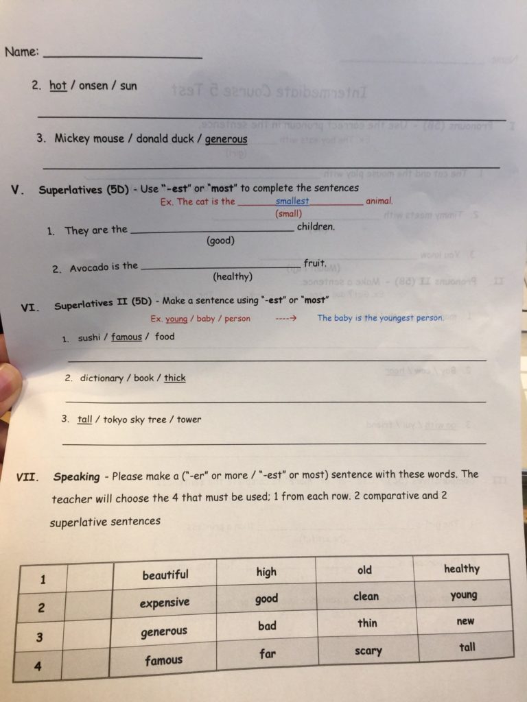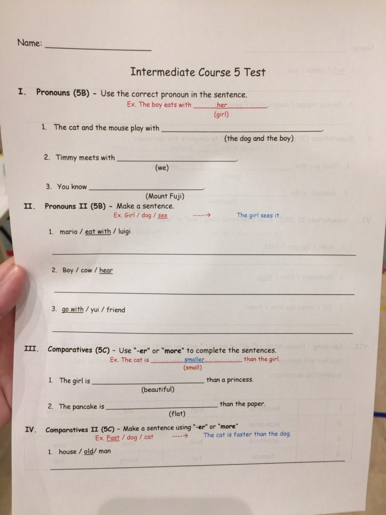 内容はPronouns(代名詞)Comparatives(比較級)Superlatives(最上級)についてで、採点方法の確認ととくにWritingではどんなミスが多いか初めに説明がありその後スタートしました。