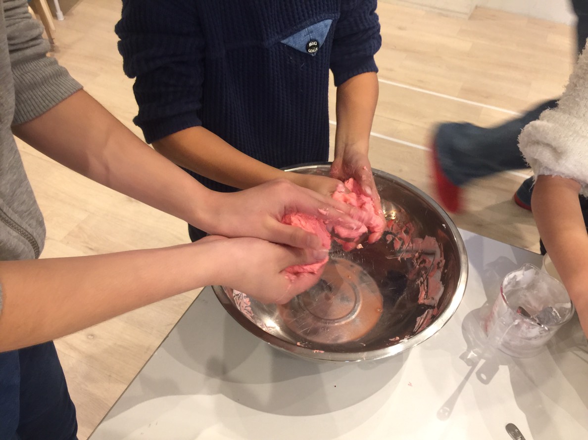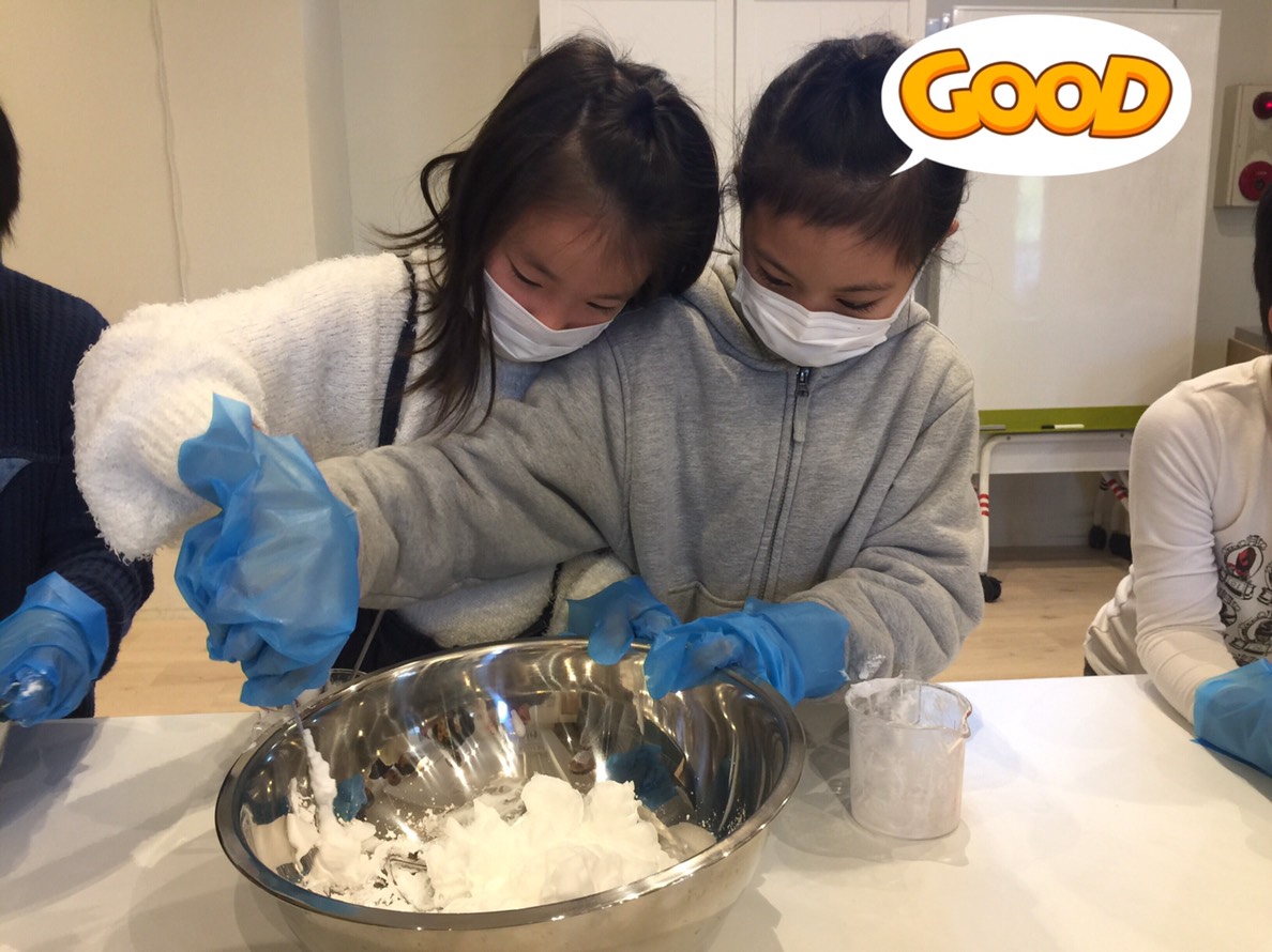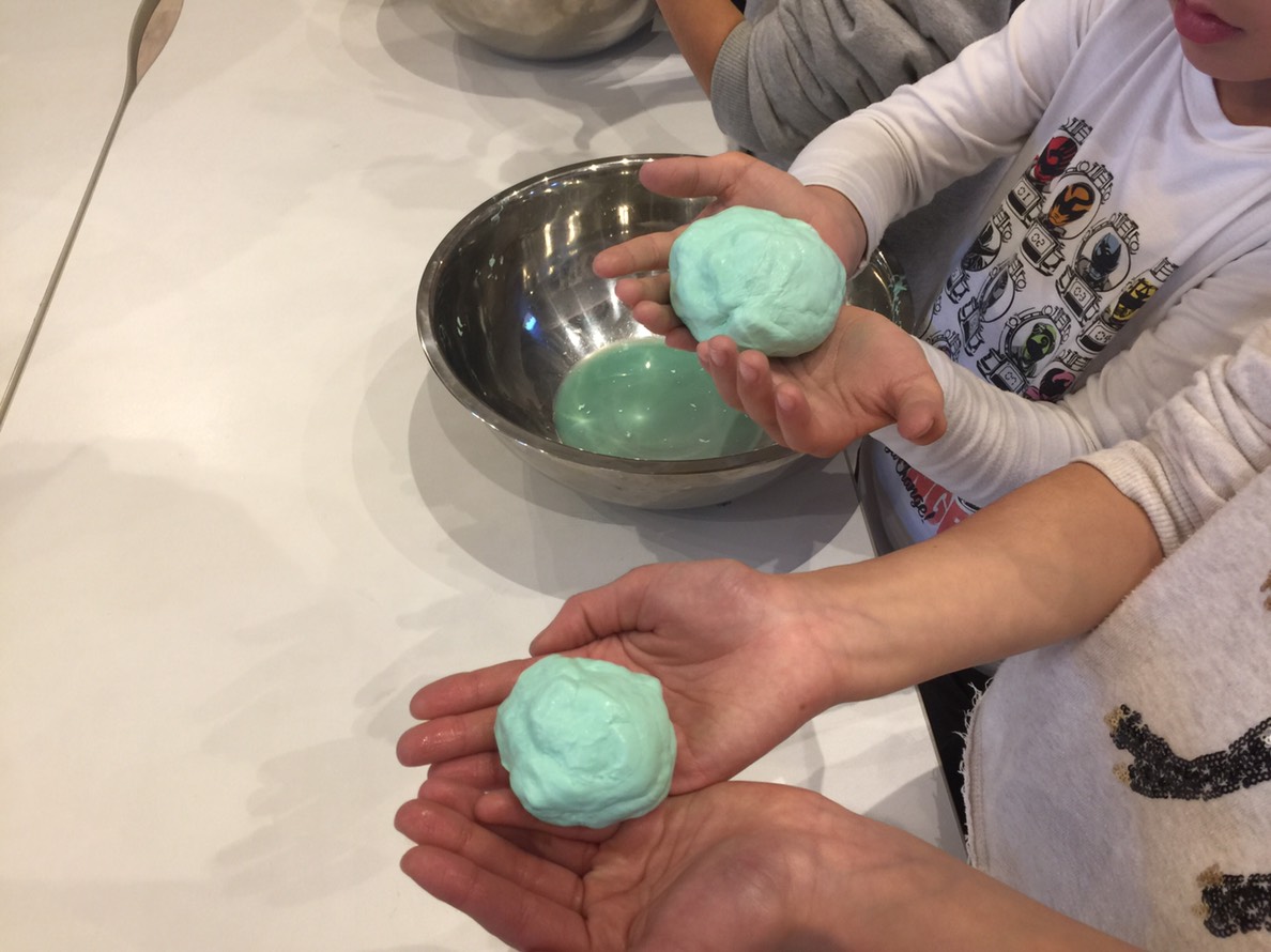 材料と手順を確認して、先生達に手伝ってもらいながらスライムを作りました。