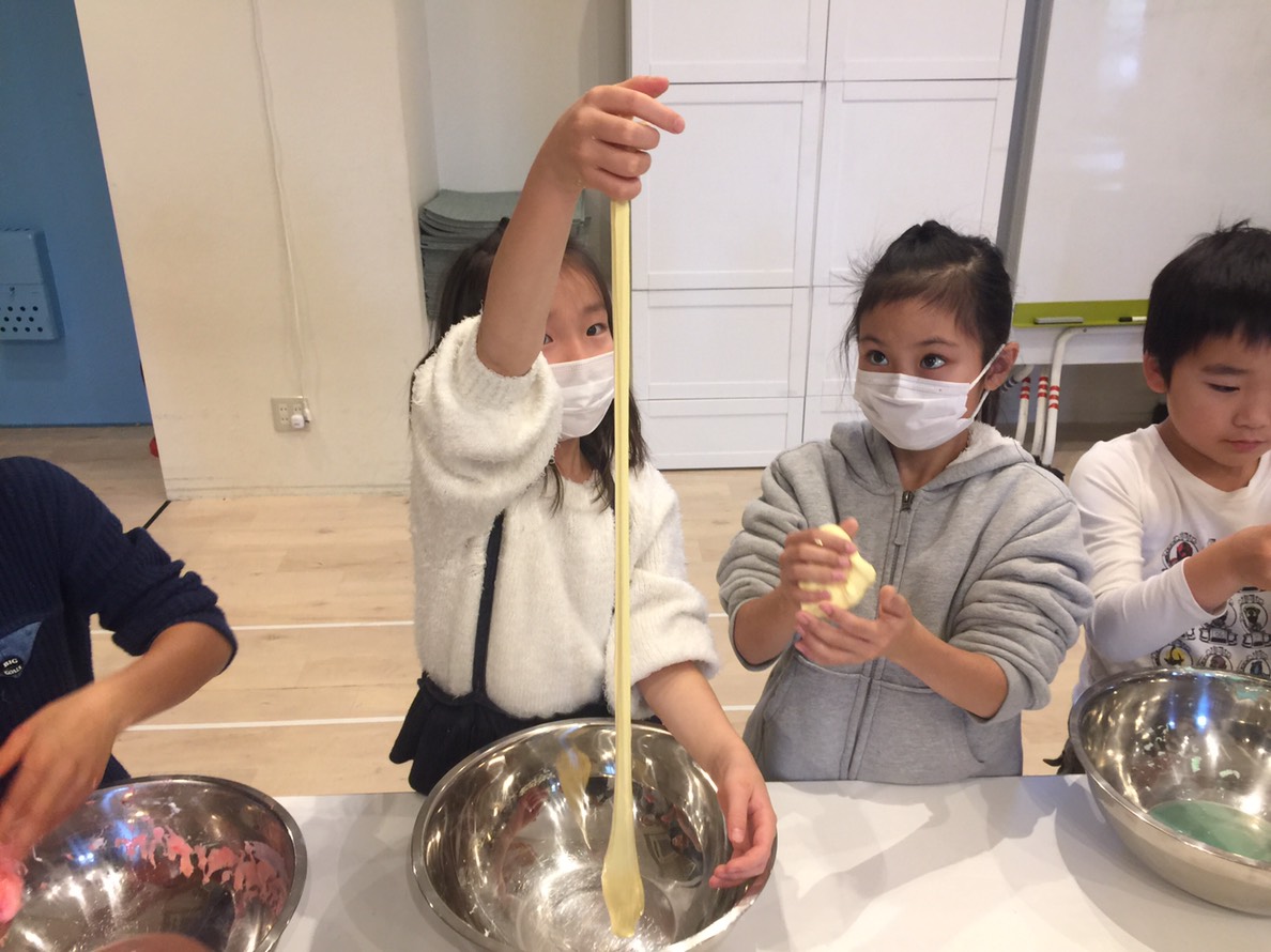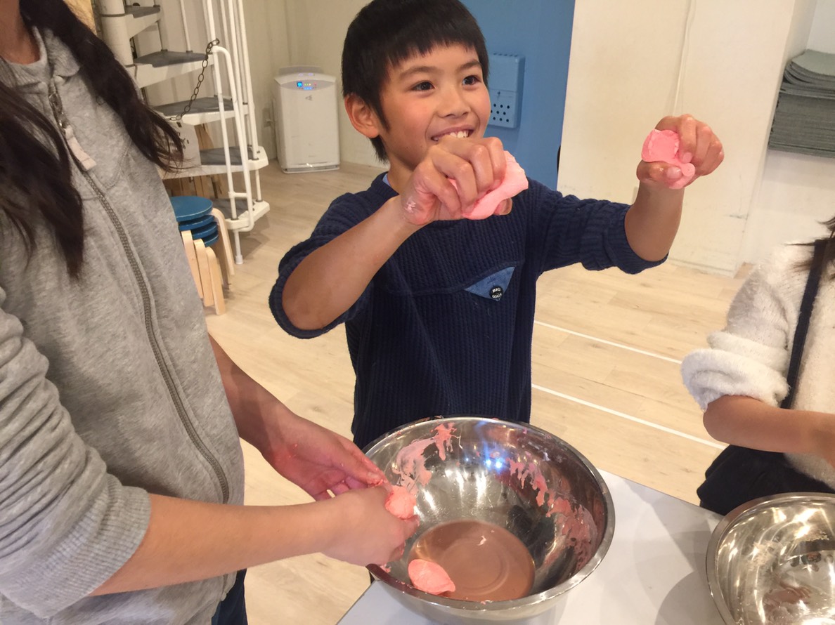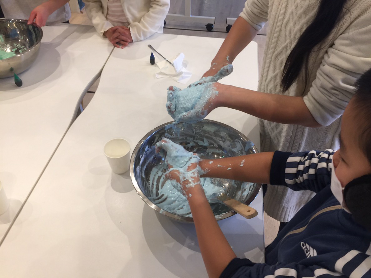 材料と手順を確認して、先生達に手伝ってもらいながらスライムを作りました。