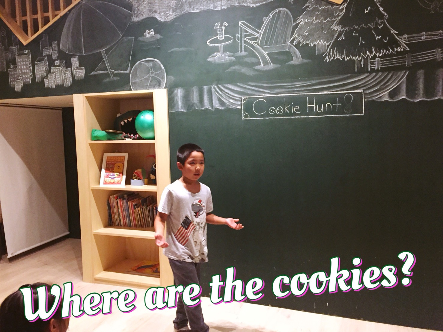 (クッキーはどこかな?きっとテーブルの上だな・・・いや、ちがう)