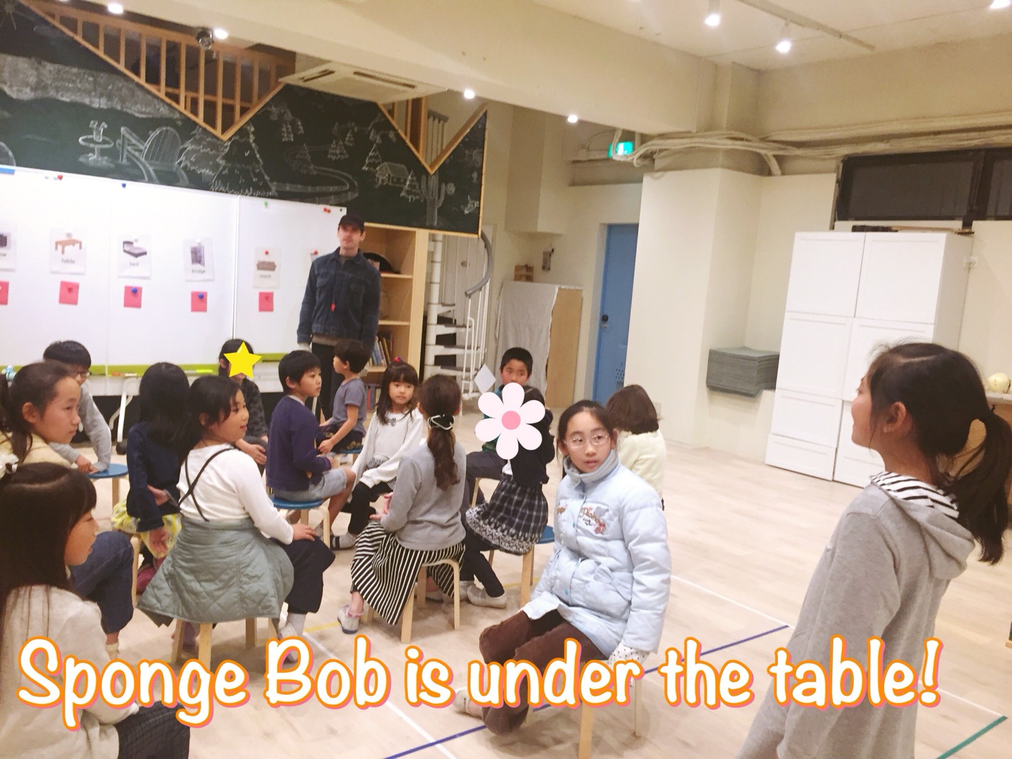 ストーリータイムの表現にでてくる前置詞の練習では、ホワイトボードにはってあるカードをみながら、センテンスで答えをいっていきます。みんな上手に表現できるようになってきましたね!