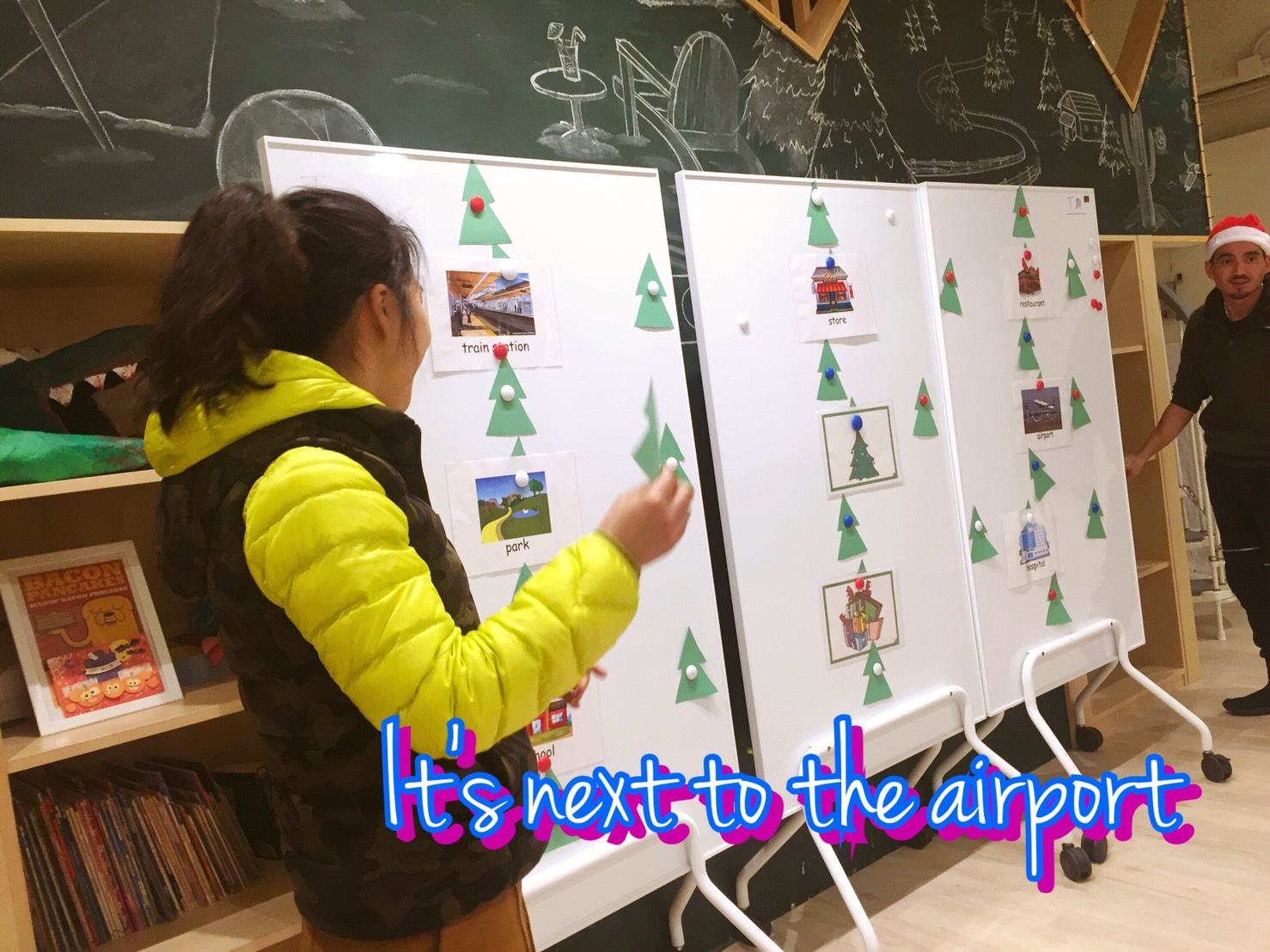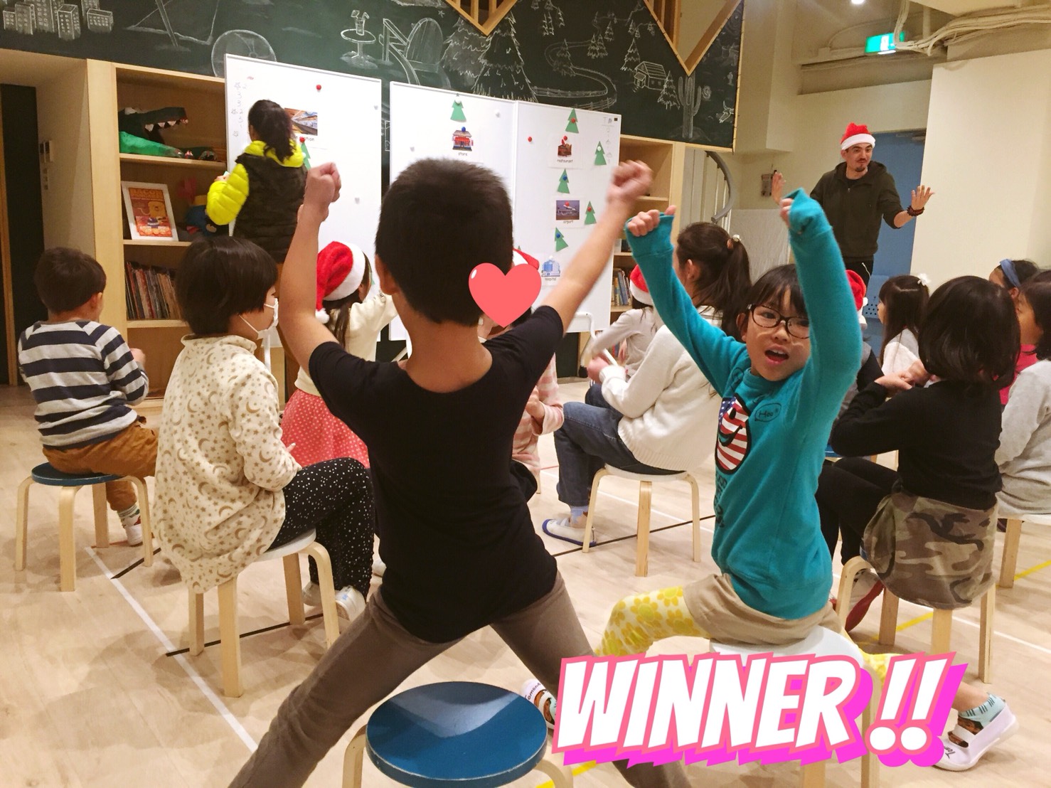 今週はクリスマスウィークでクリスマスにちなんだゲームを行なっています。先月から練習している前置詞の単語をつかいながらセンテンスをつくって遊ぶゲームです。