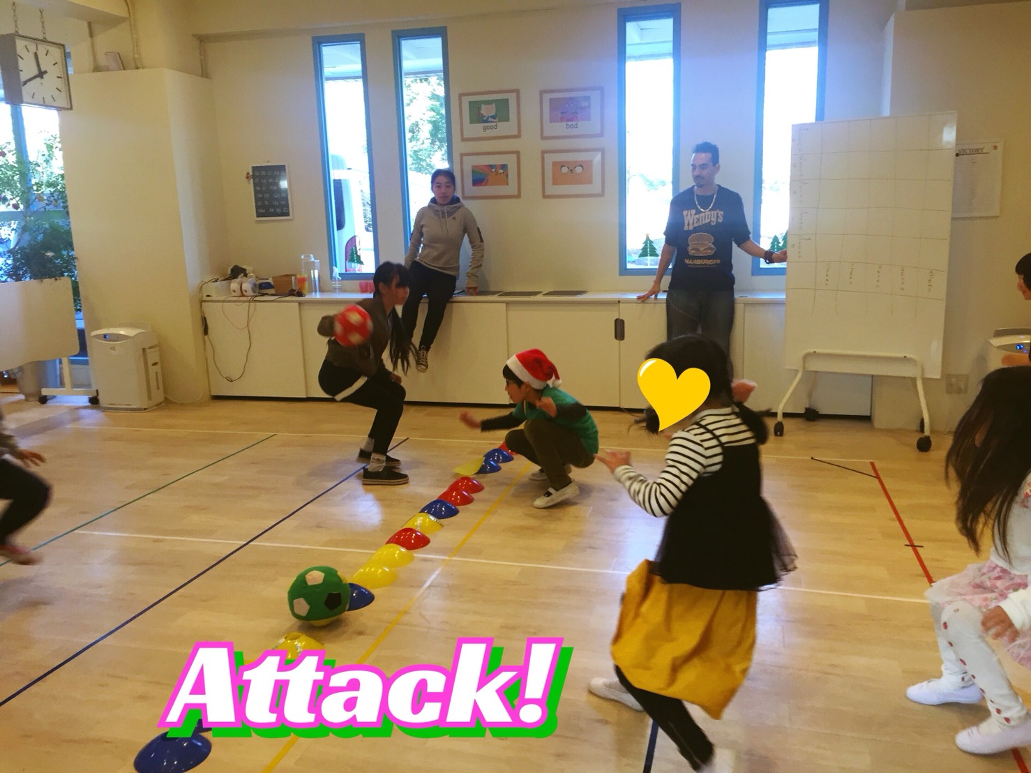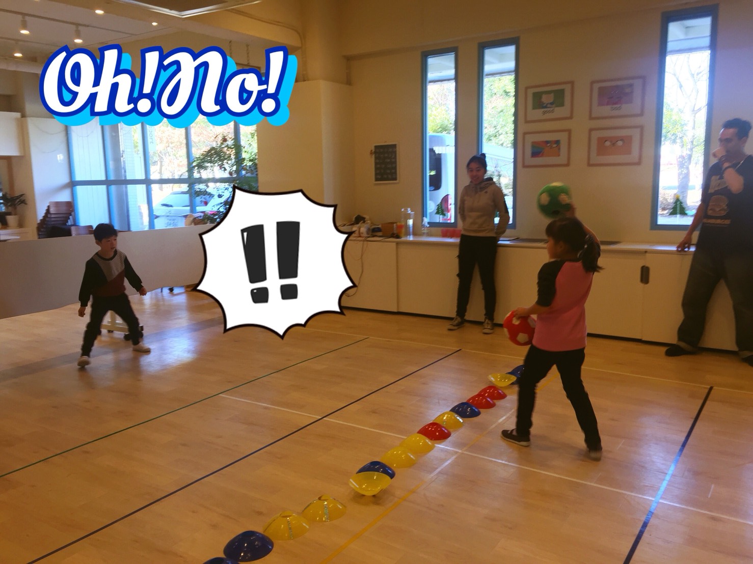 フワフワのクッションボールが思ったところに飛ばずに少し苦戦している子。