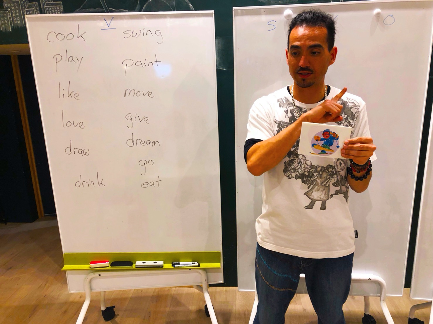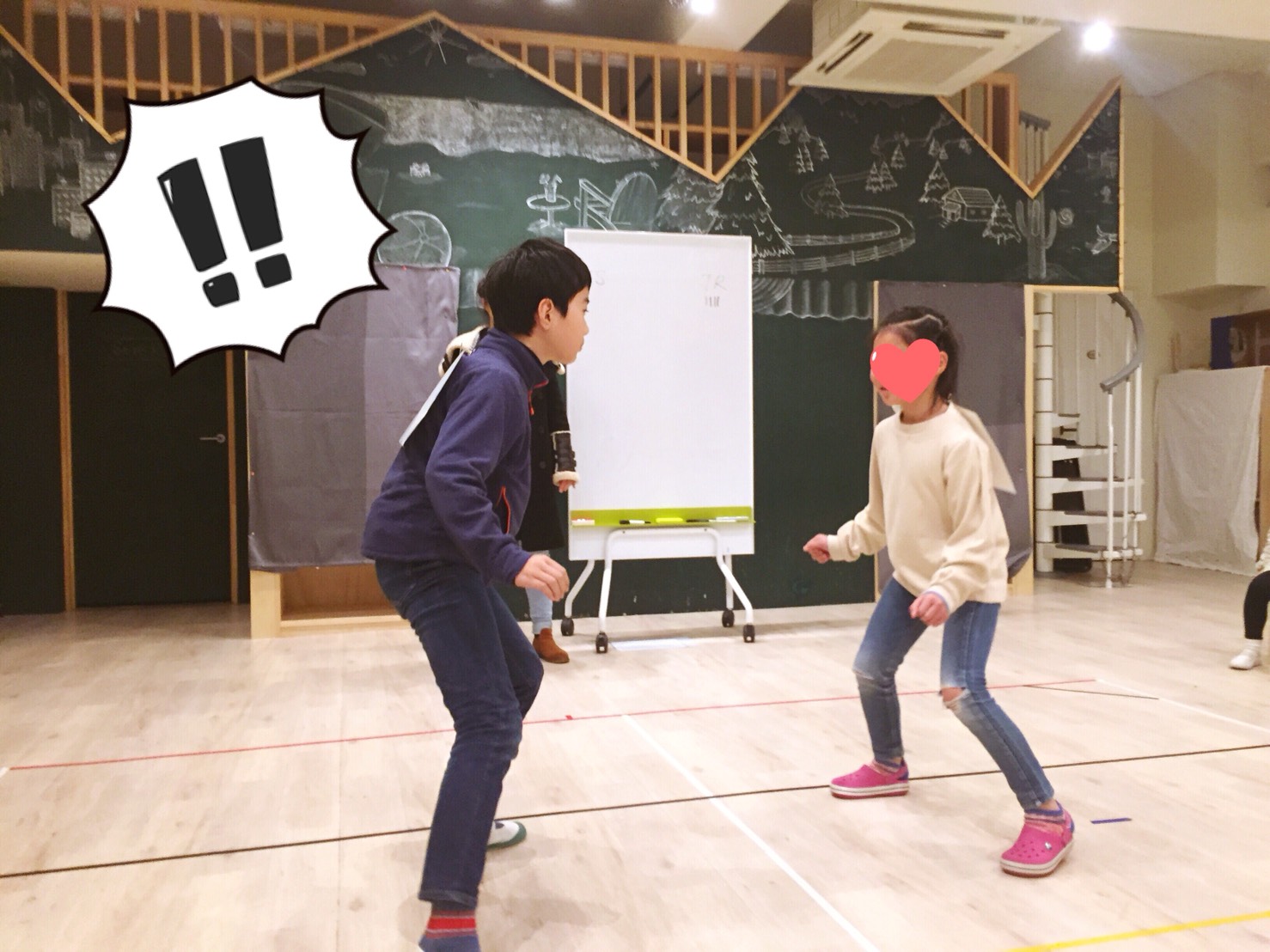 先生:”I am dancing. What are you doing?”(ダンスをしてるの。あなたは何をしてるの?)