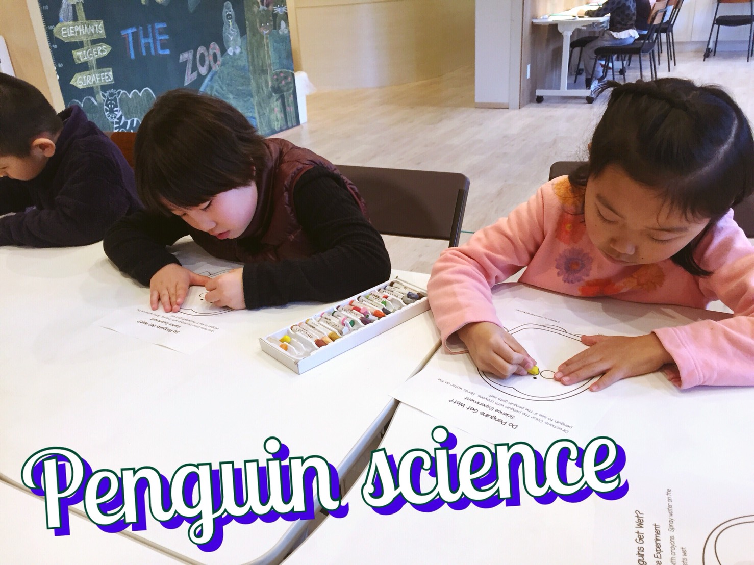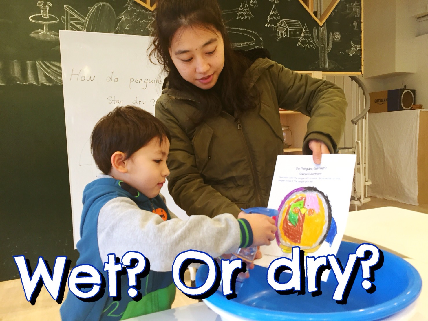 ペンギンの絵を油性クレヨンで塗って、水をスプレーしたら濡れちゃうかな?それとも濡れないかな?