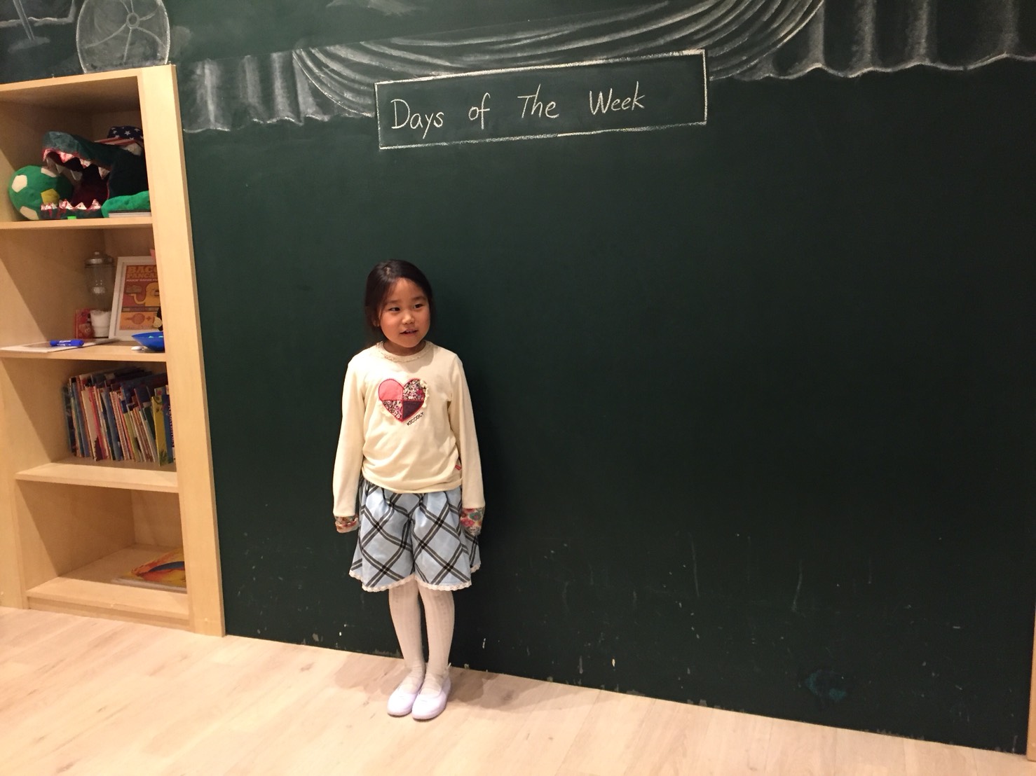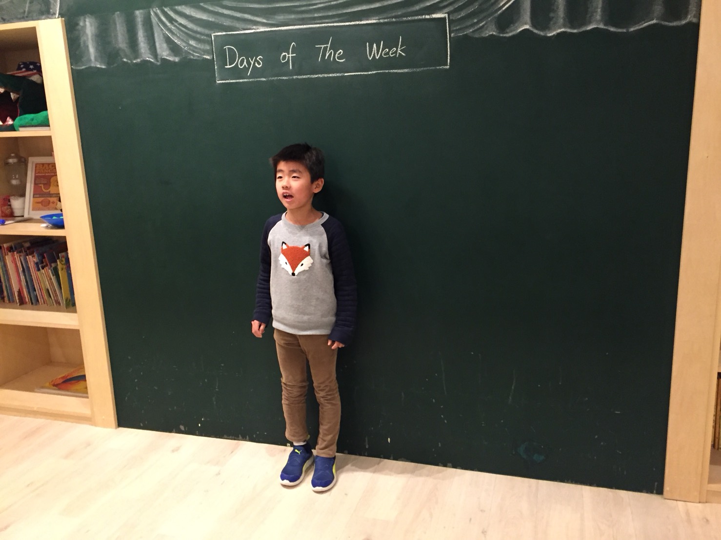 引き続き、今日の”Story time”(ストーリータイム)も”Days of the week”(曜日・一週間)のストーリーをやりました。先生:”Remember guys, we are going to start the next story at some point.”(どこかのタイミングで、次のストーリーを始めるからね)