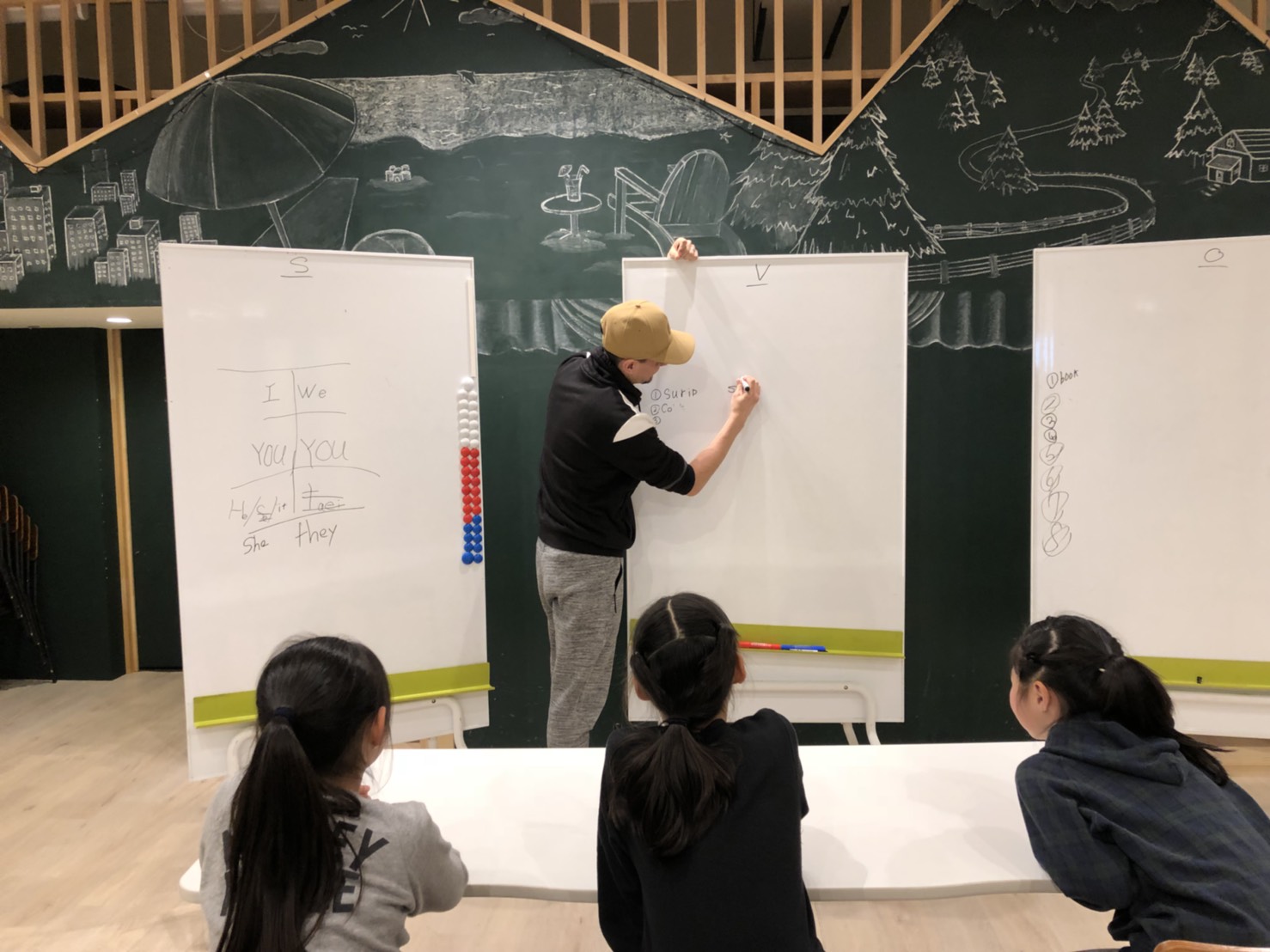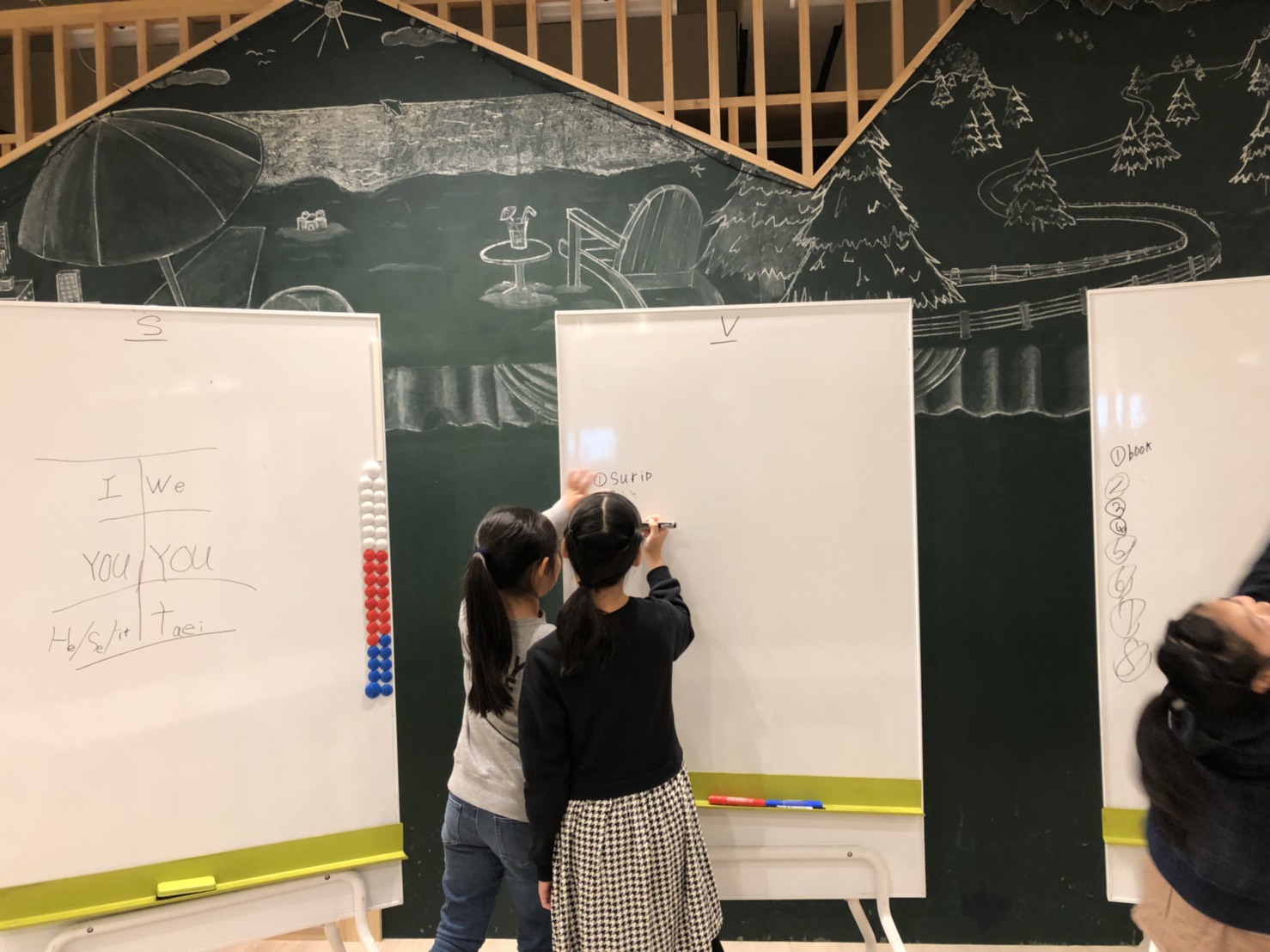 先生がSとVとOだけをホワイトボードに書いてくれ、あとは当てはまる単語を自分たちで考えて書きます。