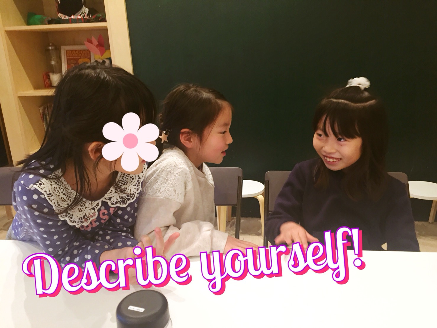 おやつに”Chocolate banana bread”(チョコレートバナナブレッド)を食べて、引き続き今月の”Target language”(覚えて欲しい言葉)まんさいのアクティビティをたくさんやりました。“Q&A”(質問と回答)の時間は“Describe yourself”(自分のことを説明をする)