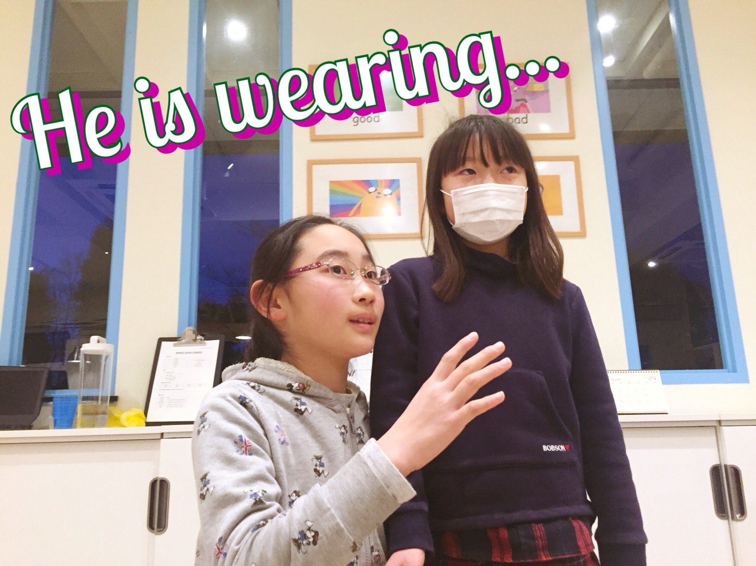 応用で”She/he is wearing 数字 +色 +目的語.”(彼女/彼は○個の〇色の○○を着ています)のセンテンスを作るゲームをやりました。