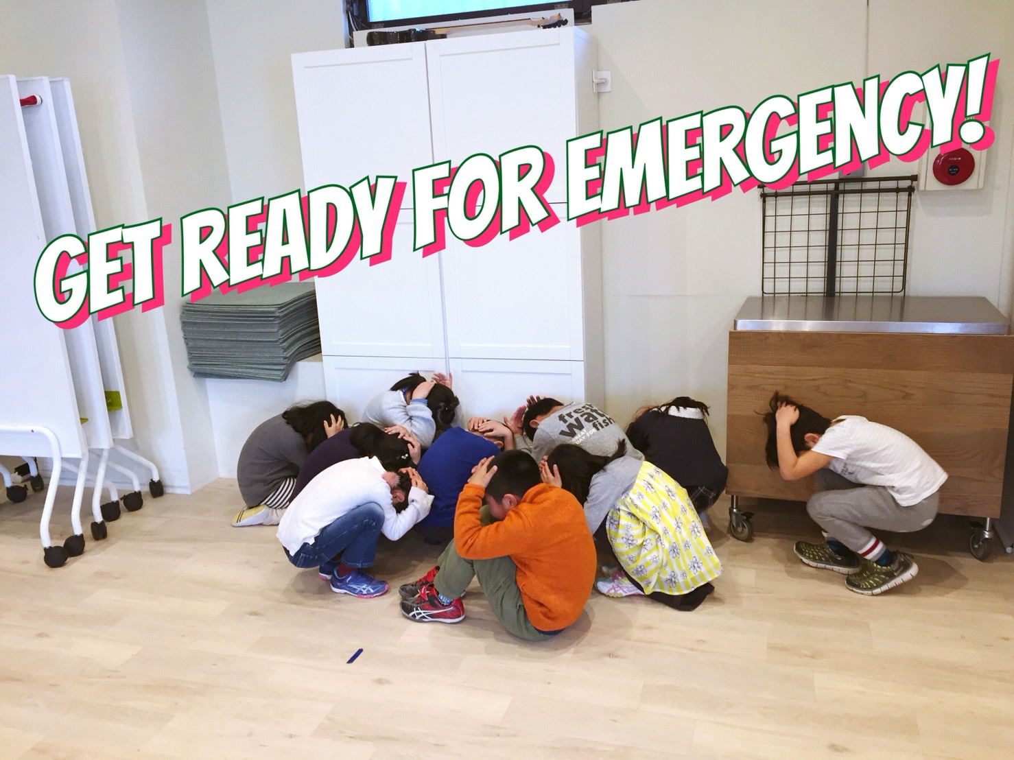 久しぶりの避難訓練でしたが、お互いに助け合って、声を掛け合ってスムーズに行えました。“Duck down.”(しゃがんで)