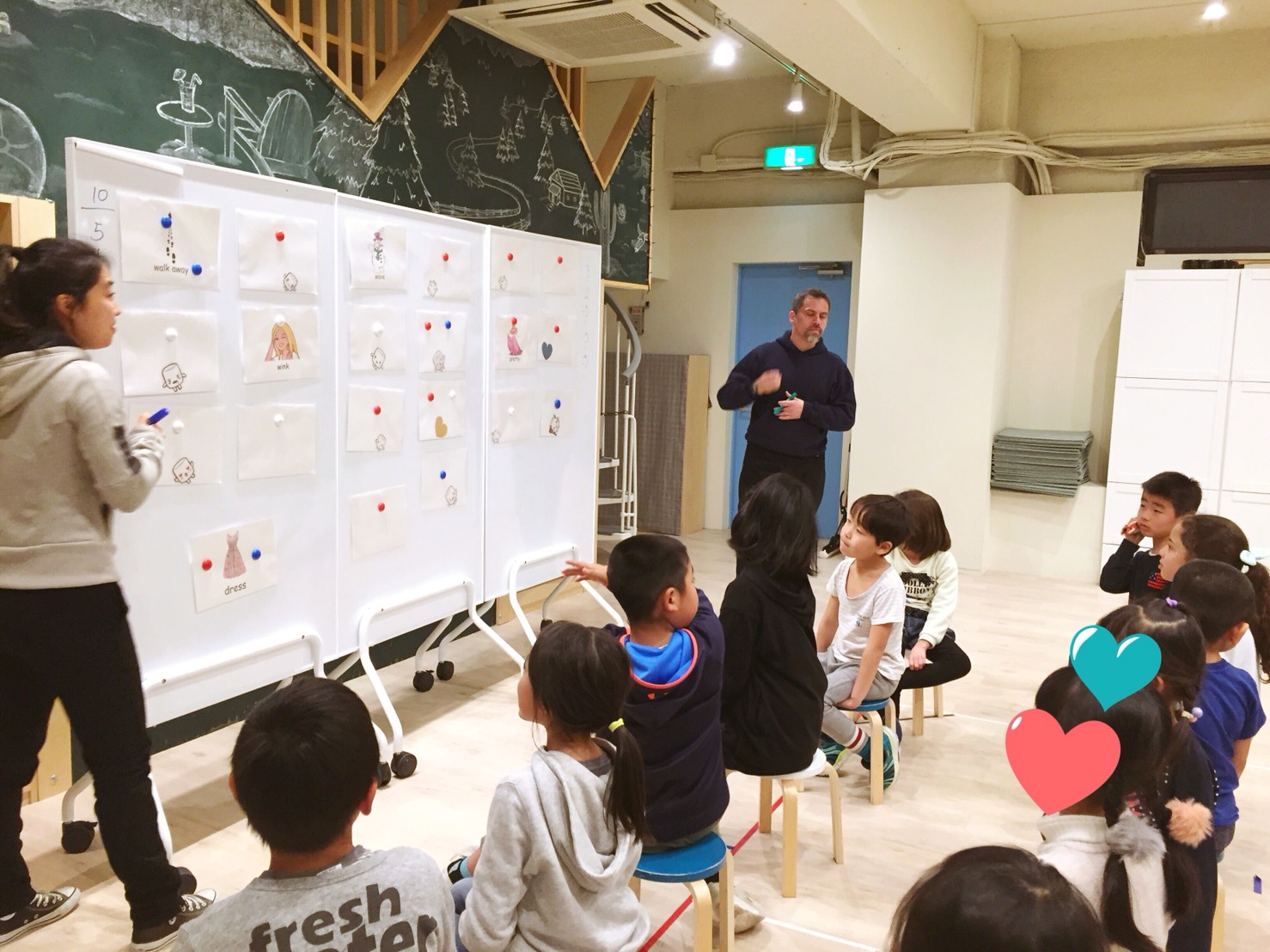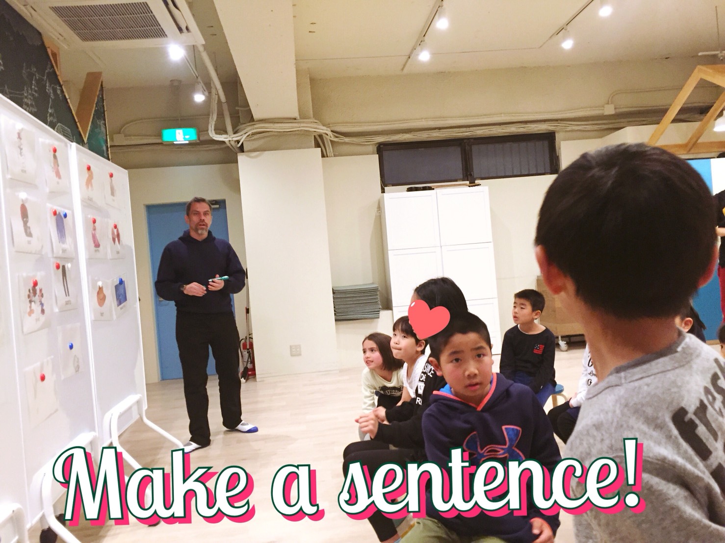ホワイトボードに貼ってあるフラッシュカードの単語を選んで、センテンスを作ります。短いセンテンスでも長いセンテンスでも大丈夫。