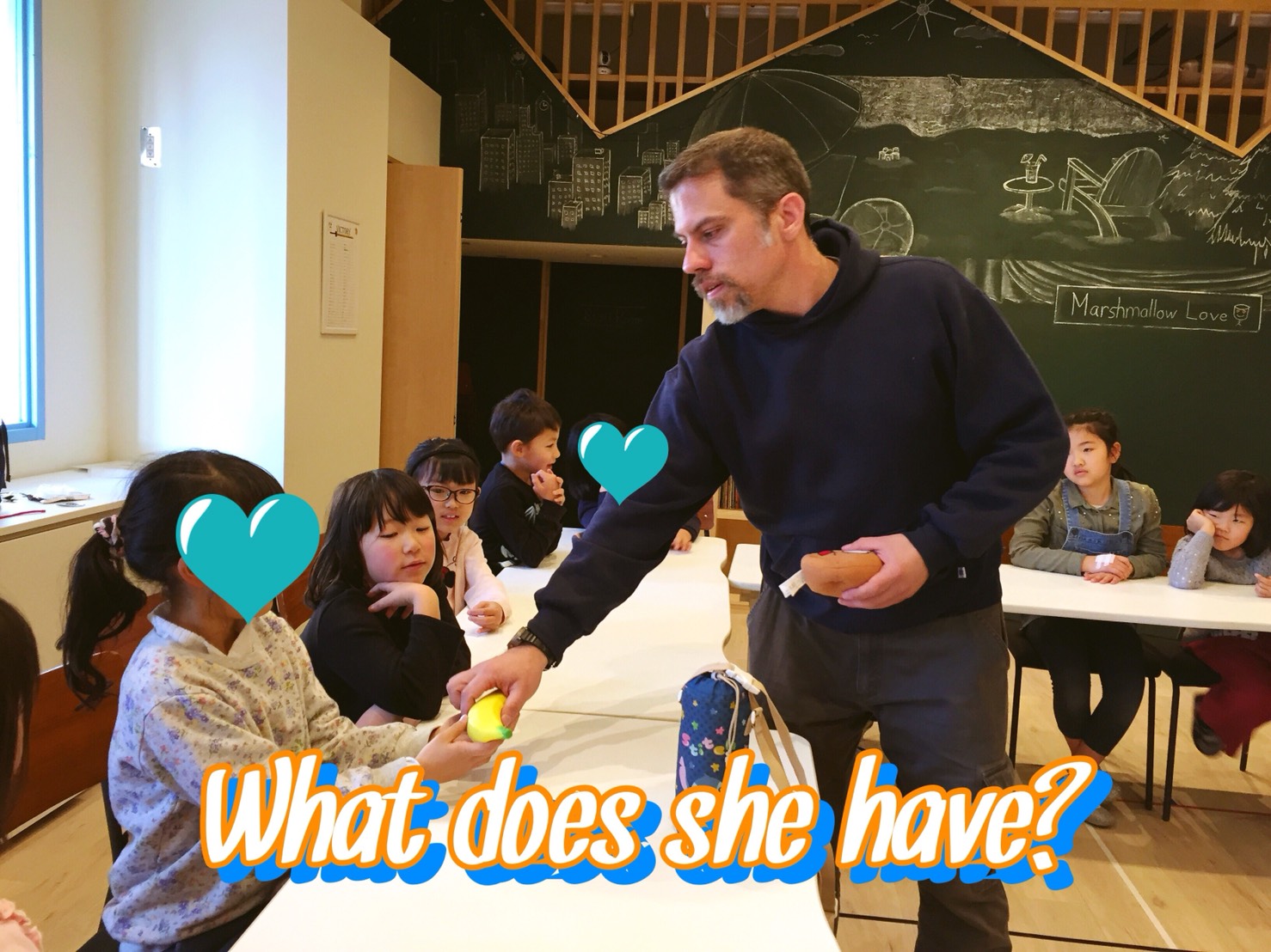 “What does he/she have?”(彼/彼女は何を持ってる?)“He/she has a banana/potato.”(バナナ/ポテトを持ってるよ)