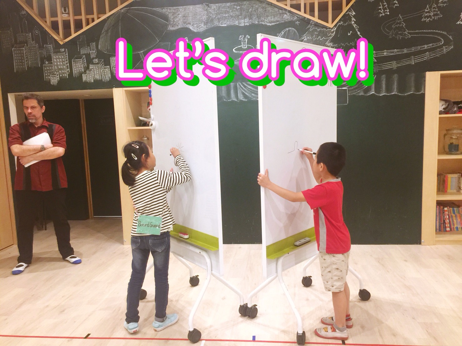 続いてはまず、2名の生徒さんが先生に英単語を見せてもらいます。その単語をそれぞれ生徒さんがホワイトボードに絵を描いていき、それぞれ何の絵なのか?