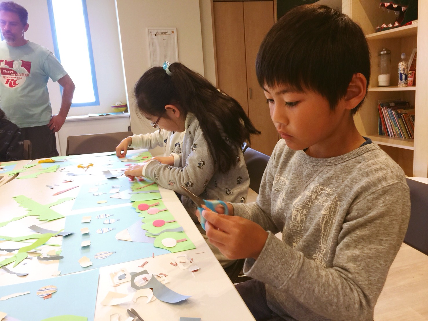 先生や生徒さんたちが予め丸や長方形、三角などに切っておいてくれた各パーツを使ったり、自分たちで好きなように形を切り取ったり。