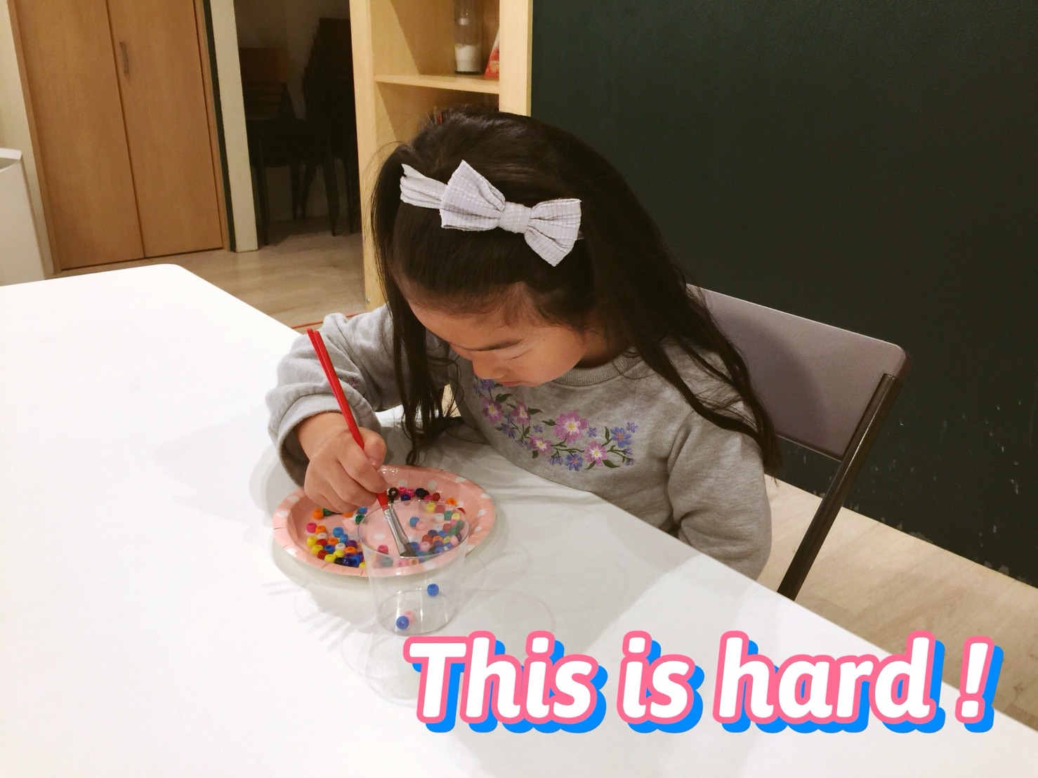 2チームに分かれて、一人ずつ順番に”How many beads can you get with chopsticks?”(お箸でビーズを何個取れるかな?)に挑戦。