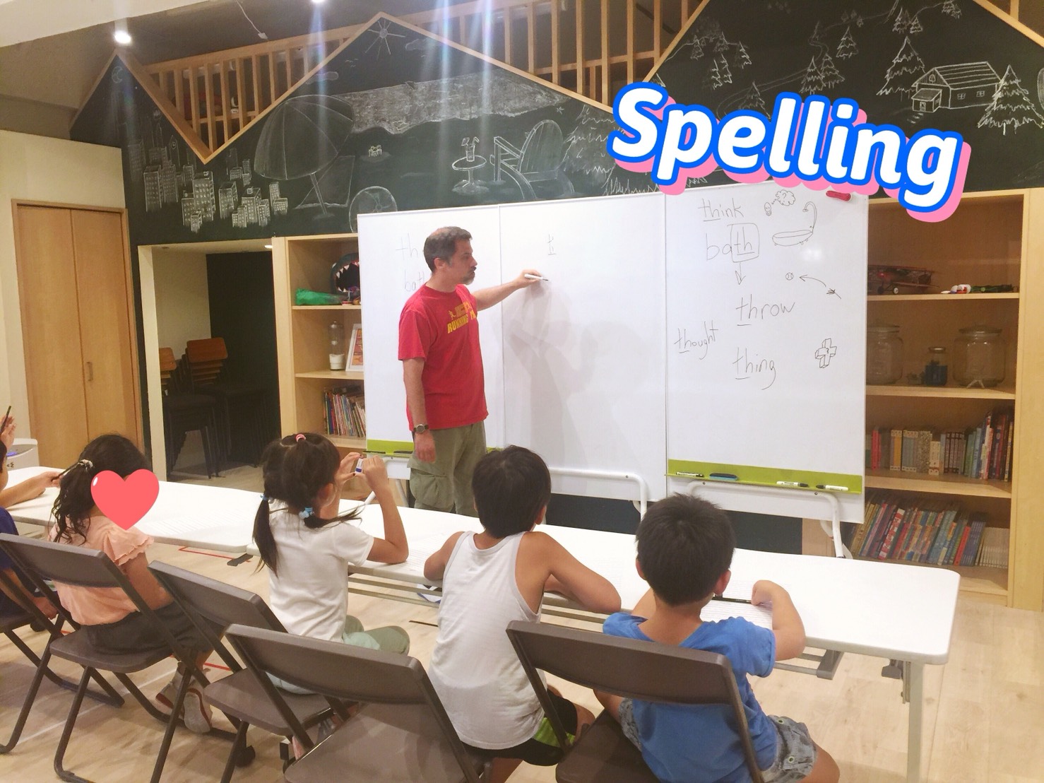 先輩生徒さんたちは、先生の発音を聞いてその綴りを当てるフォニックスのゲームを行いました。