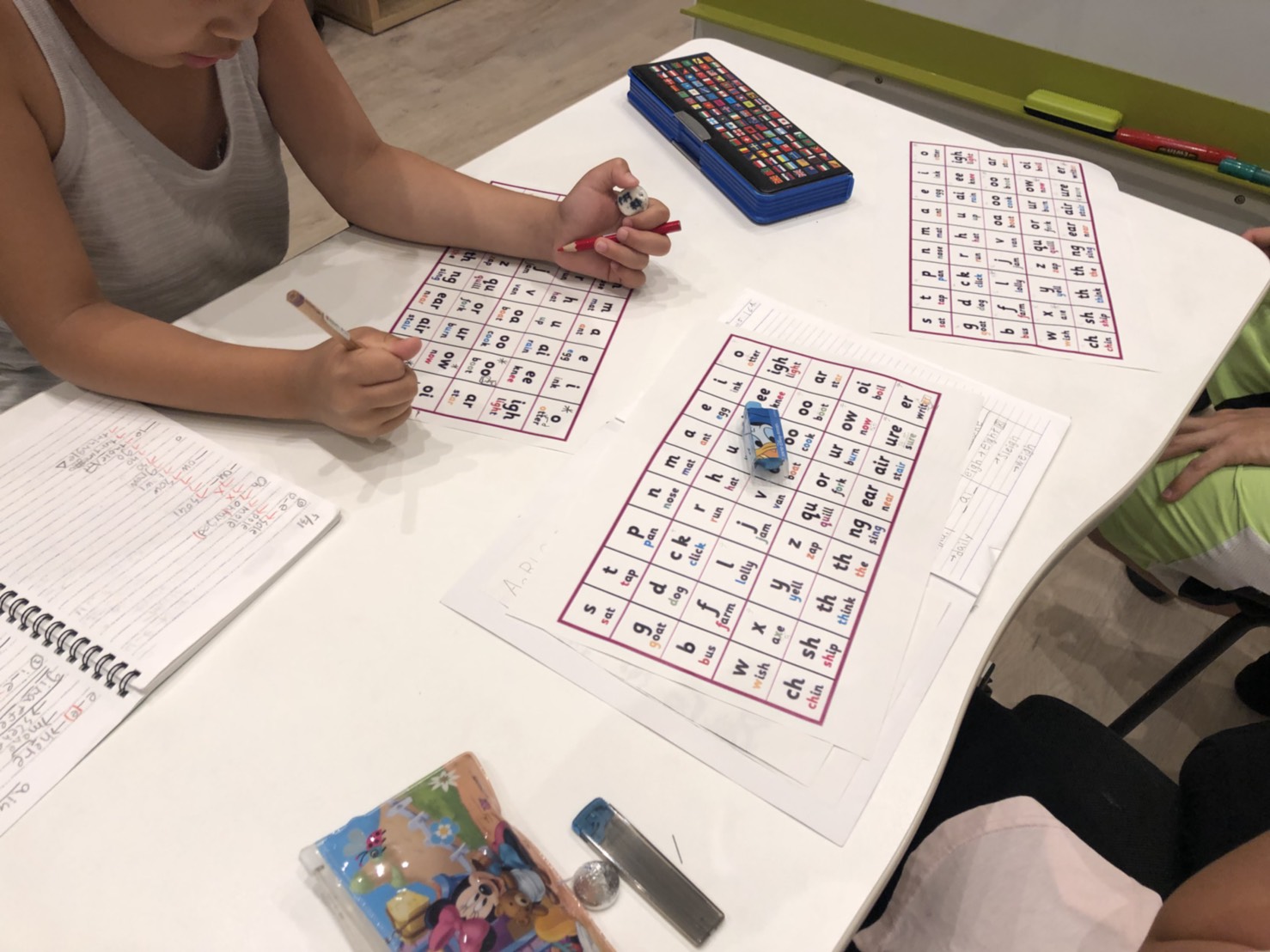 キッズパスポートに来てから、宿題がなかったり終わった生徒さんは、レベルに分かれて基礎レッスン。ビギナー生徒さんたちは、アルファベットの練習。読んだり、書いたり、神経衰弱をしたり。